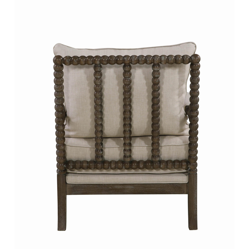 With a modern twist on traditional design, this accent arm chair makes a statement. Warm beige upholstery adds texture to the seat, back, and arms. Rounded sphere details decorate the front legs and frame. Smooth and refined, the silhouette is full of clean angles that elevate a living room. Add visual intrigue to a neutral space with the interesting geometric shapes.
