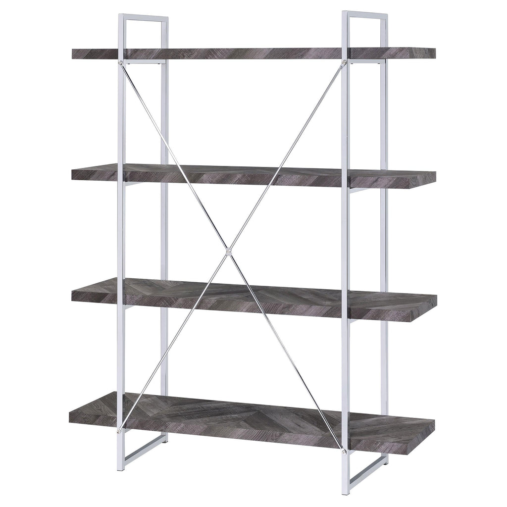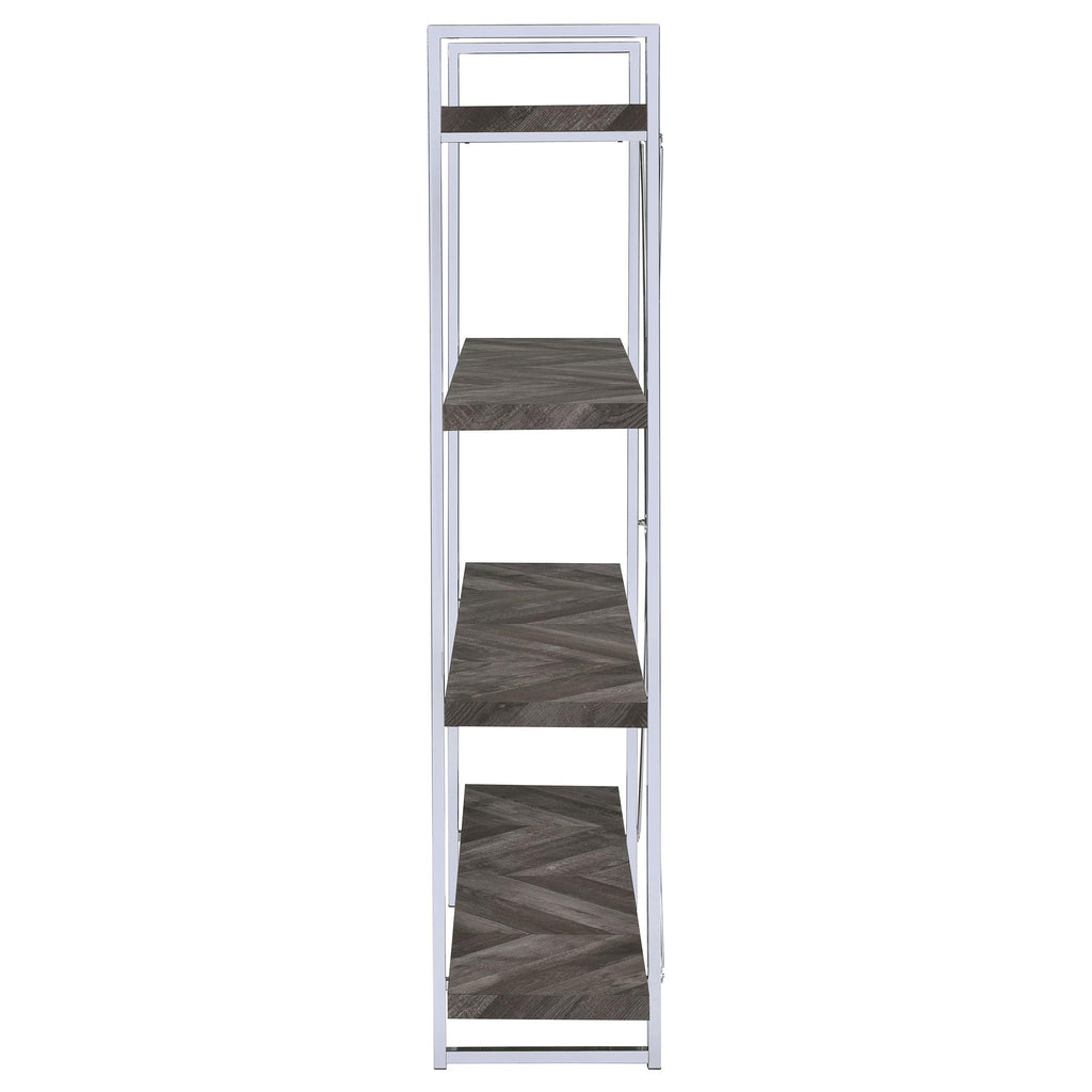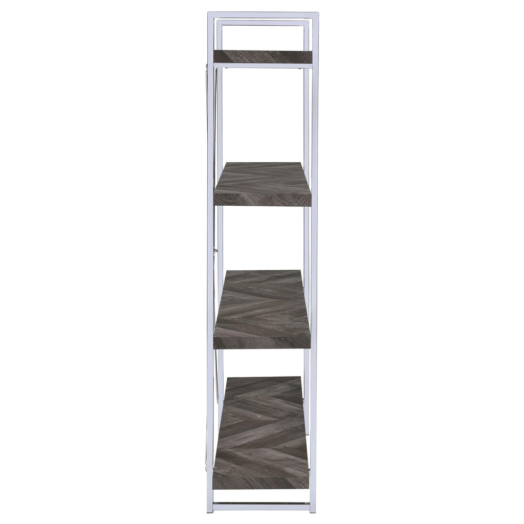 Perfect for storage or display, this wooden bookcase exudes understated glamour. Its frame is comprised of crisp, clean metal lines with an eye-catching, X-shaped design on the back. Its shelves are crafted with high-quality wood for added sturdiness and durability. A rustic grey herringbone finish blends beautifully with the high-shine chrome finish of its frame. With its simple yet stately design, this contemporary bookcase is a stunning addition to any modern home.