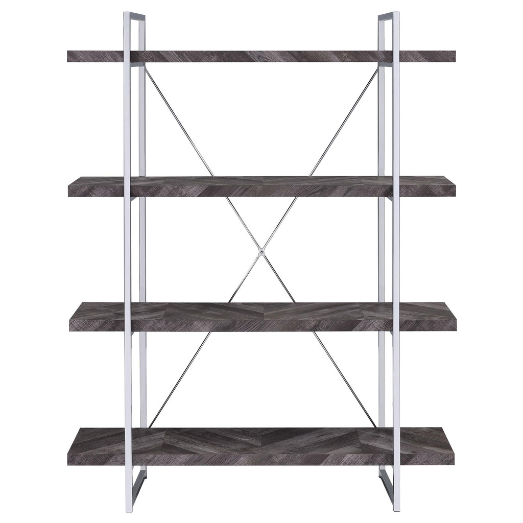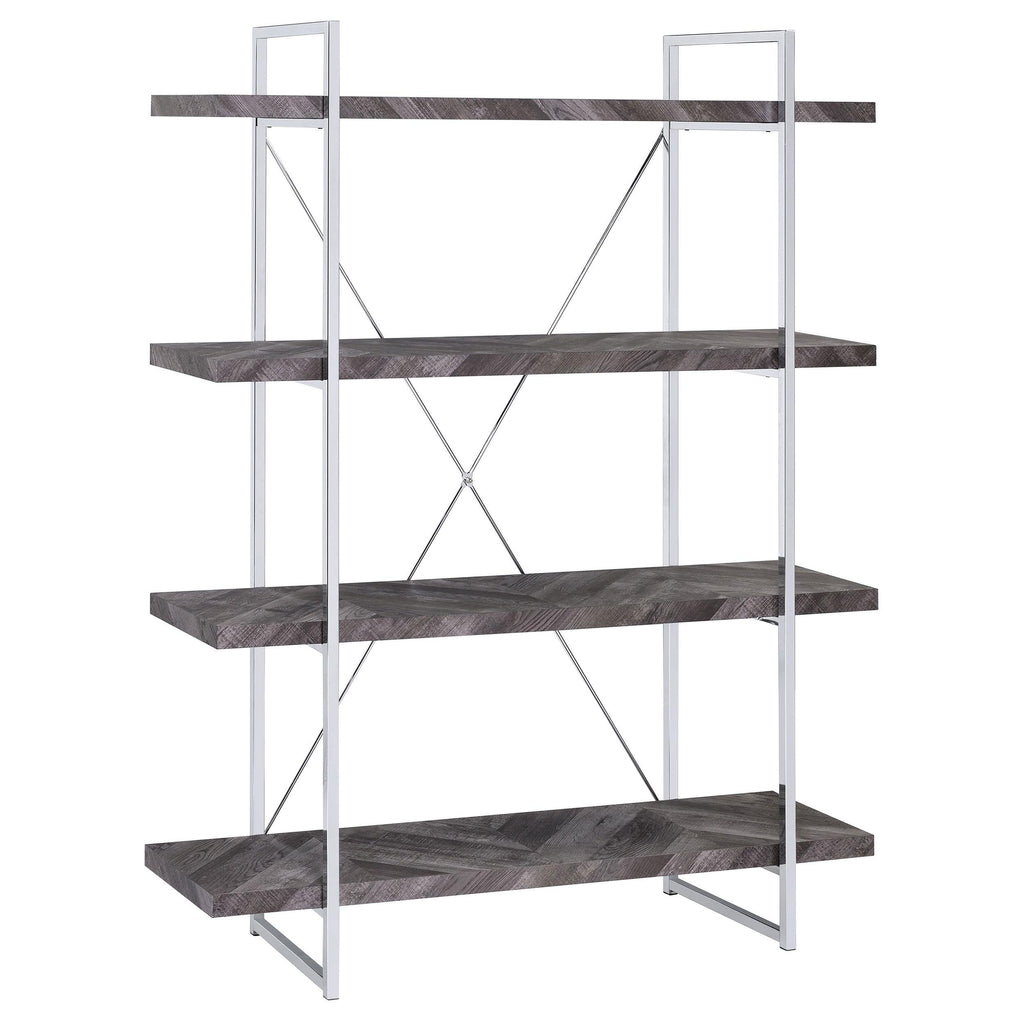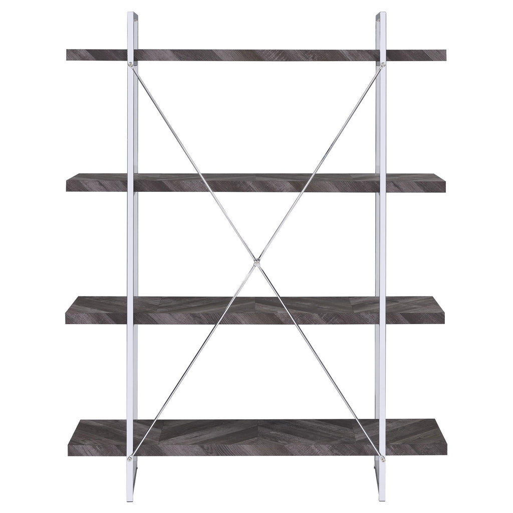 Perfect for storage or display, this wooden bookcase exudes understated glamour. Its frame is comprised of crisp, clean metal lines with an eye-catching, X-shaped design on the back. Its shelves are crafted with high-quality wood for added sturdiness and durability. A rustic grey herringbone finish blends beautifully with the high-shine chrome finish of its frame. With its simple yet stately design, this contemporary bookcase is a stunning addition to any modern home.