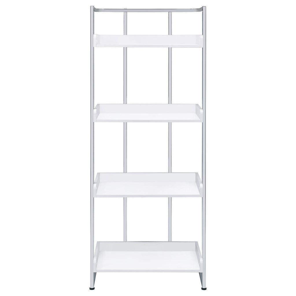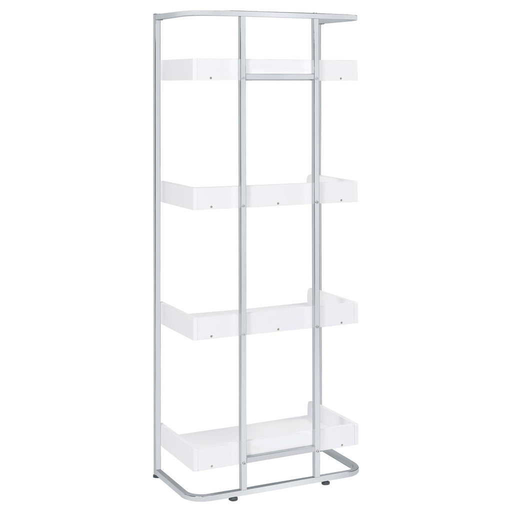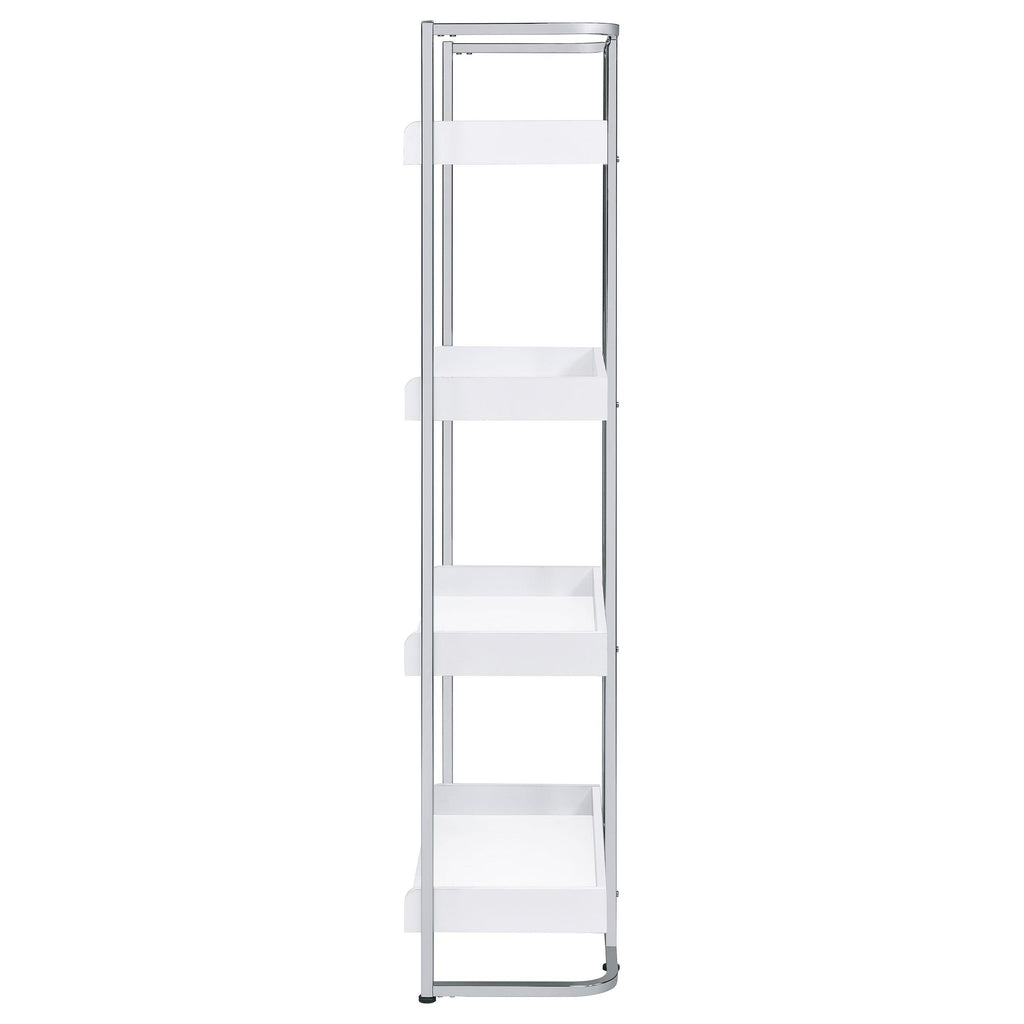 A steel bookcase is bound to steal your heart with its stylish appearance. Four roomy shelves allow for displaying your favorite novels. With its open back design, you'll have no trouble finding the ideal spot in your modern office. Its construction ensures a durable and long-lasting upgrade. This piece is supported on a rounded open base.