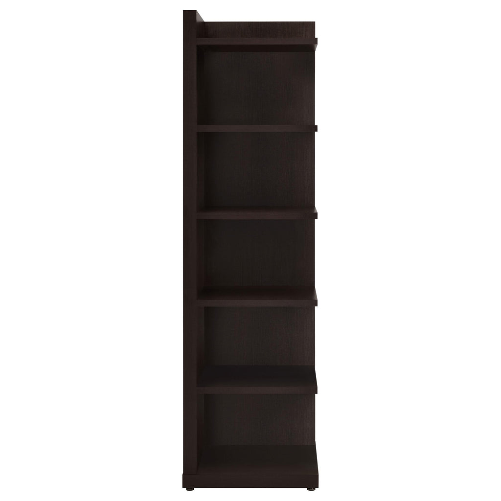 Display your book collection with style and pride. This bookcase features six convenient shelves to show off your personal library. Ideal for smaller spaces, it tucks neatly into a corner to free up precious square footage. A handsome cappuccino finish gives it a classically chic appearance. Crafted from durable MDF, particle board, and engineered veneer, this bookcase is strong, sturdy, and stunning.