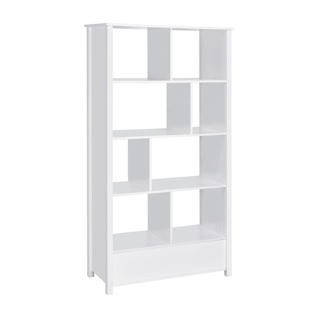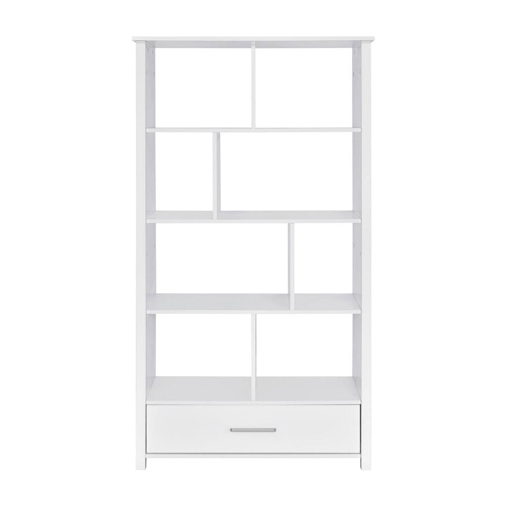 Asymmetrical shelves stack against one another to create this stunning, contemporary bookcase. A stylish, eye-catching addition to a home office, this minimalist bookcase invites you to organize office accessories or showcase decor and family photos. Eight separate sections divide items categorically if you wish, while a bottom drawer keeps items out of sight. The single drawer is adorned with a sleek, brushed zinc pull that further lends to the chic nature of this bookshelf. Versatile and functional, place this tall bookcase in the room of your choosing.