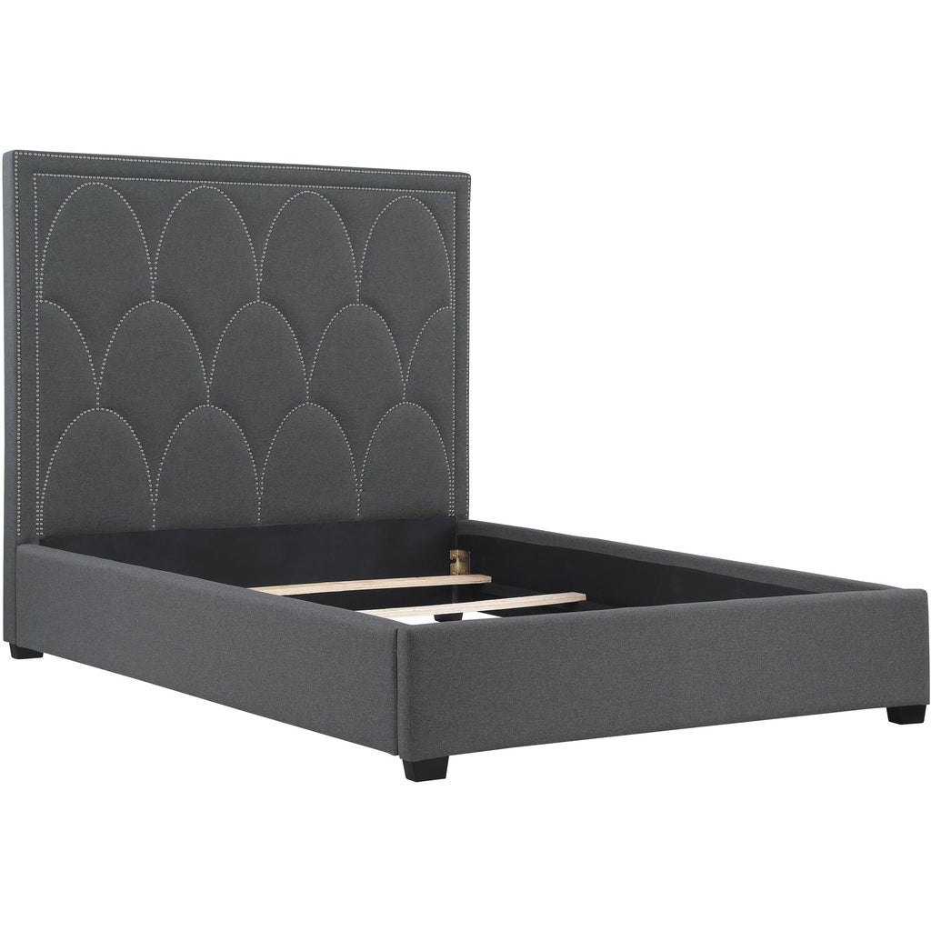 Treat a master or bedroom suite to the ultimate in Art Deco flavor with a plush, enticing panel bed. Designed to infuse romance and artistry, this decadent bed is wrapped in charcoal linen-like fabric. Its construction features a mix of hardwoods and wood products. An extra tall headboard presents a showcase vibe with a scalloped pattern created using individually hand-driven nail heads as an outline. Matching padded side rails and footboard complete the exquisite ambiance of a must-have anchor piece for a glam boudoir.