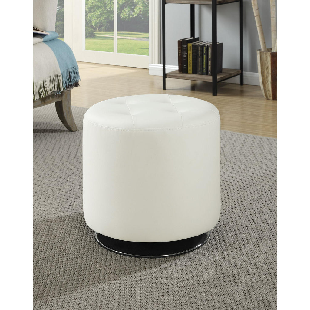 You'll love the modern flavor of this ottoman. With a hint of retro styling, it serves transitional spaces like a charm. Tall and round, its tufted seat adds a dose of ornate accent to lovely leatherette upholstery. Enjoy a fresh white finish and a chrome base. This ottoman swivels to provide extra function.