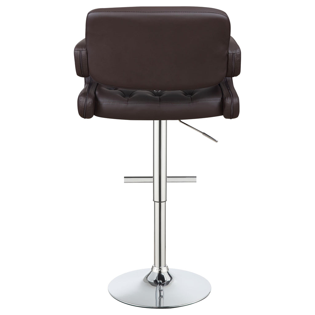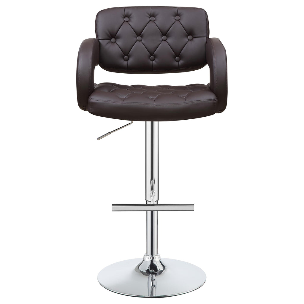 This recreation bar stool is at home at a kitchen island or in the rec room. Chrome stand and base combine with brown upholstery for a unique complement to your decor. Padded armrest makes it easy to relax like in a traditional chair. Raise the seat to get a view of the room or lower it to get lost in your thoughts. A button-tufted diamond pattern design on the backrest gives bar seating a fresh interpretation.