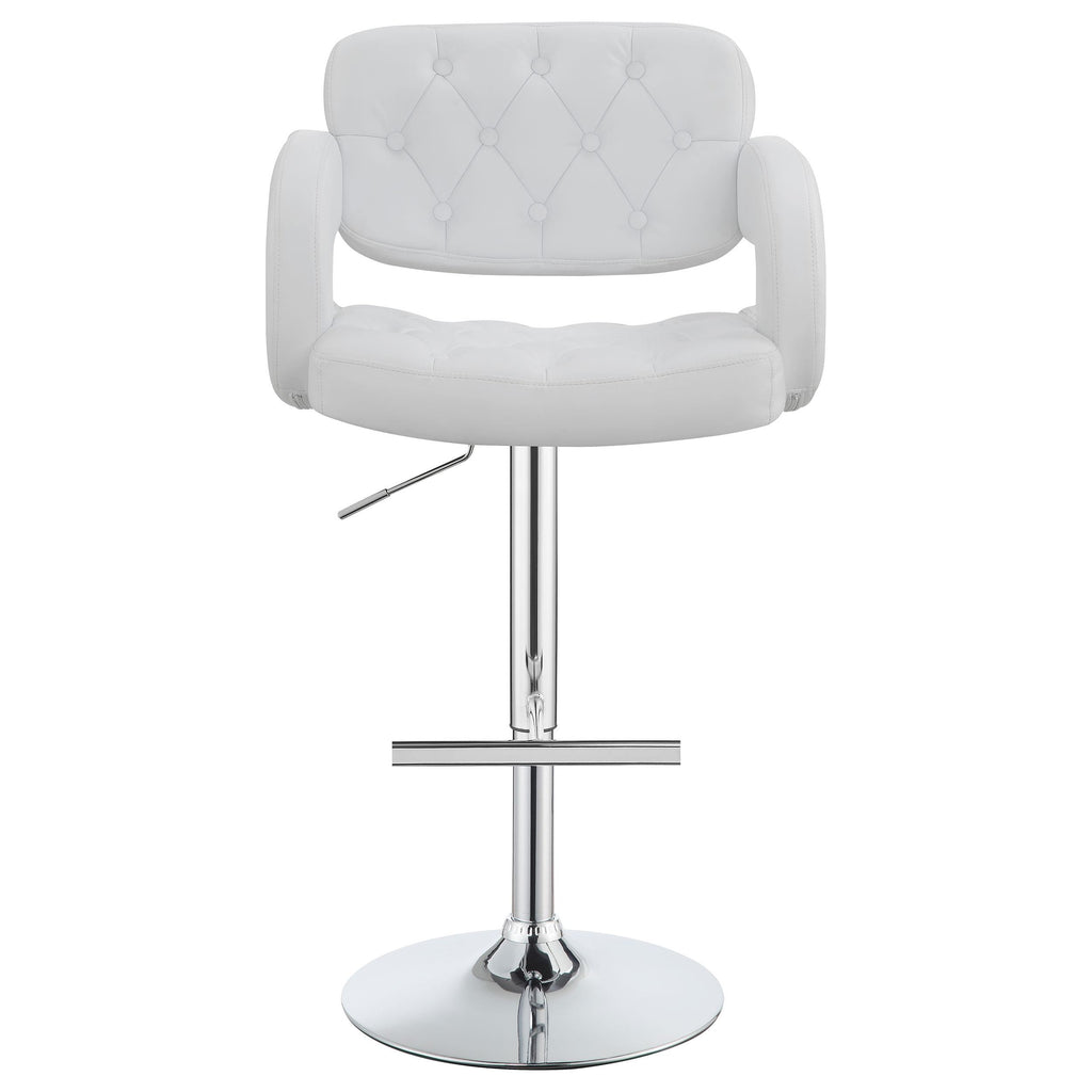 A rec room or home bar never had such chic bar seating. Chrome finish leg and base with shimmering white upholstery. Cushioned seat adjusts to maximize your presence, with chrome footrest to help maintain your perspective. Padded armrest allows you to lean comfortably in to make your point or sit back and nurse a martini. Trendy yet practical, bar stool is a modern enhancement to your home entertainment.