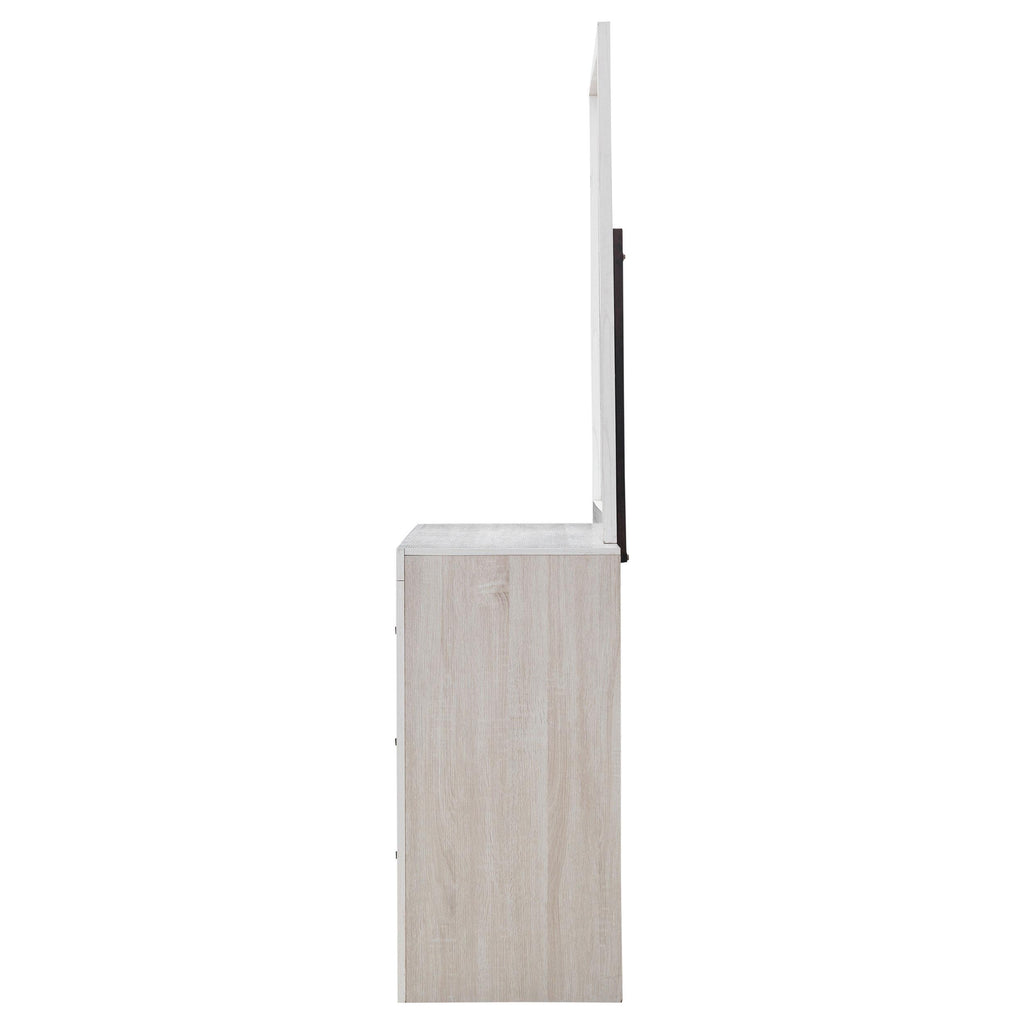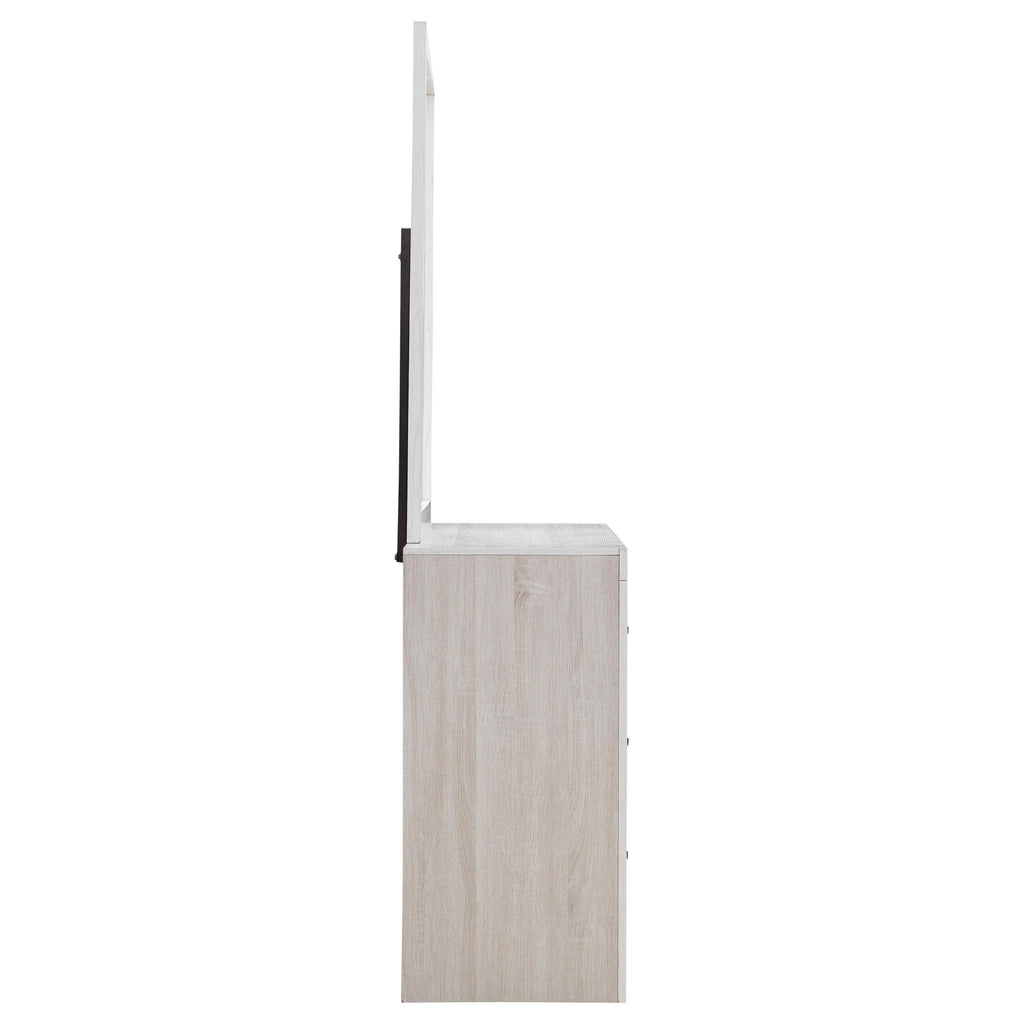Enhance your bedroom with the bold and contemporary style of this wooden dresser. The modern design features 3D paper veneer for added quality and easy maintenance, while dark bronze handles top each drawer, adding a classic touch. Deep storage drawers accommodate a variety of wardrobe essentials, making this piece as functional as it is stylish. Available in multiple finishes, this dresser easily adapts to any color palette. The large, rectangular mirror with a no-frills frame and quality 3D paper veneer enhances your space and is available in a range of attractive colors to suit your personal style.