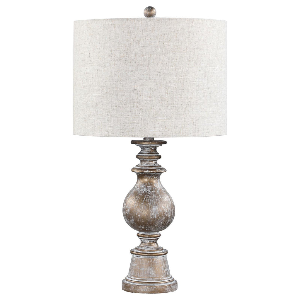Dress up end tables and consoles with this elegant, contemporary table lamp. Designed with a contoured poly frame with intricate details, this sophisticated table lamp lends itself to transitional interiors easily. Enhanced by the weathered appearance of the antique gold finish on the base, this table lamp is sure to bring about an old world charm. A straight, round drum shade with an oatmeal colored fabric offers a hint of texture and a light accent to the metallic base. A three-way switch allows you to adjust the lighting to your desired illumination.