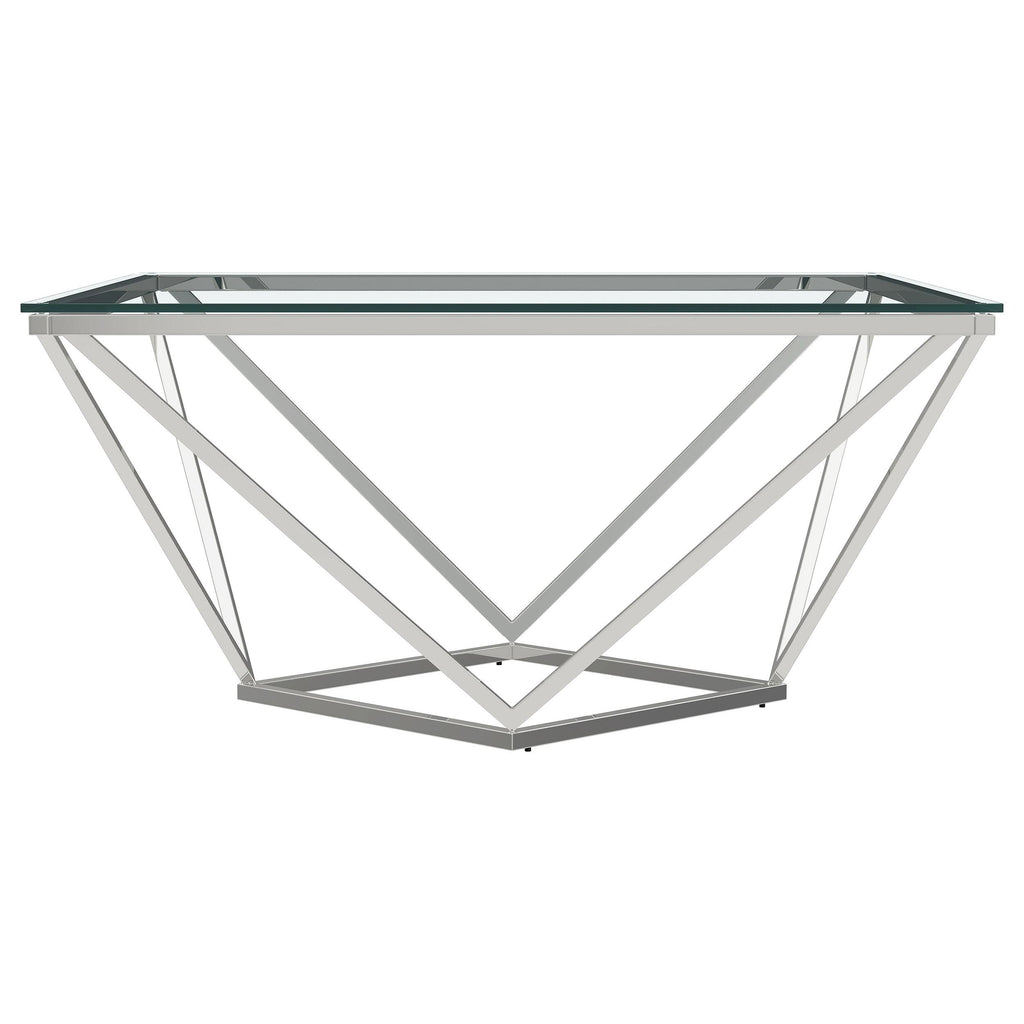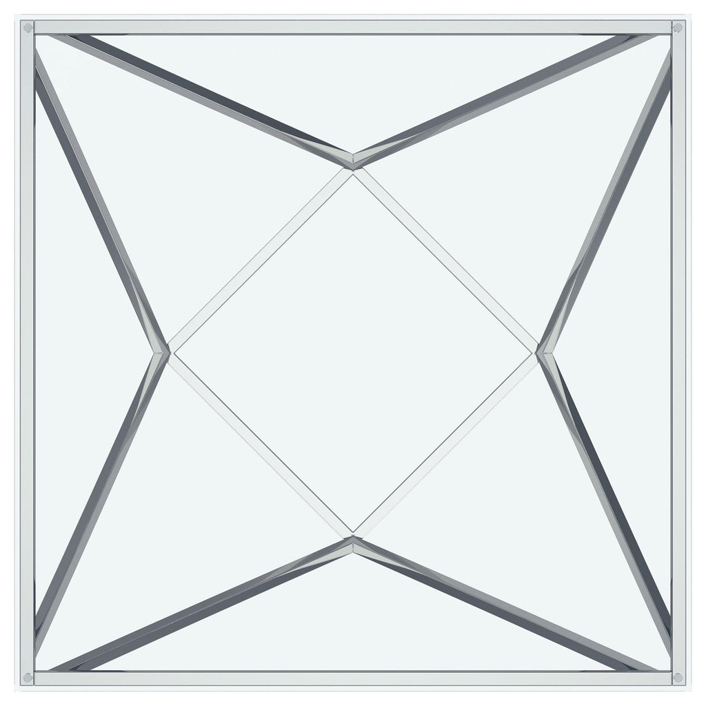 This modern end table showcases a bold geometric base in a polished nickel finish, paired with a durable clear tempered glass top. The tempered glass surface offers scratch resistance and effortless upkeep, while the nickel-finished steel frame ensures lasting stability. Its open framework design brings a contemporary, lightweight aesthetic, ideal for minimalist or industrial-inspired interiors. This versatile accent table blends functionality with style, making it a perfect fit for modern living spaces.