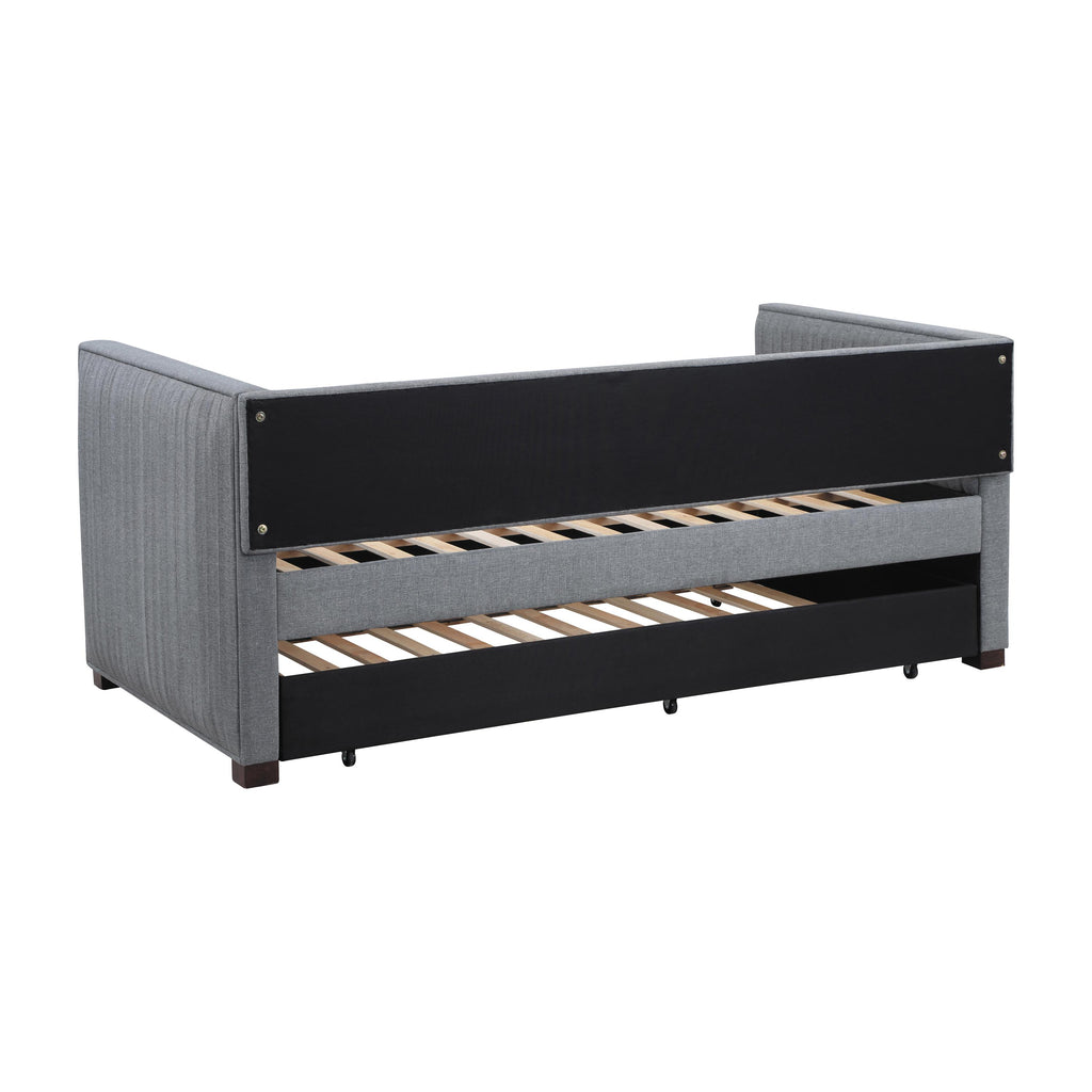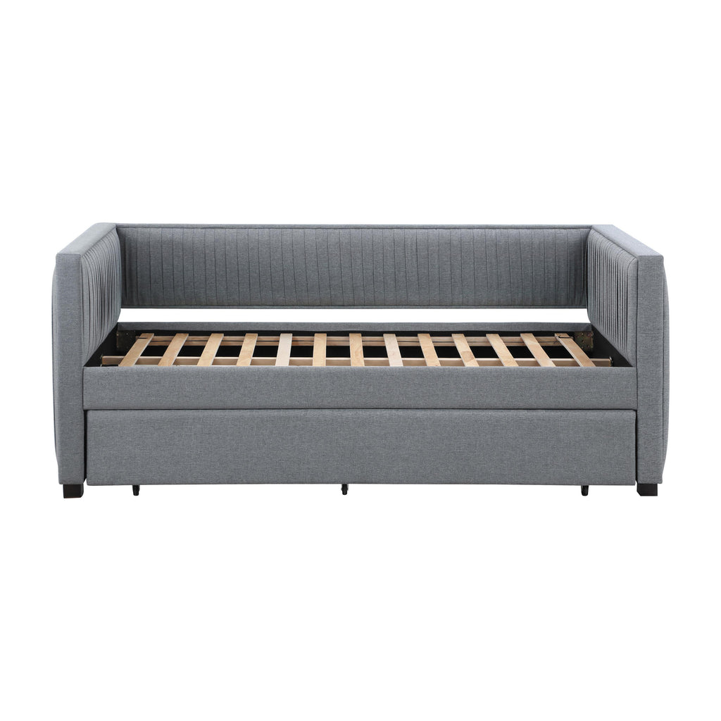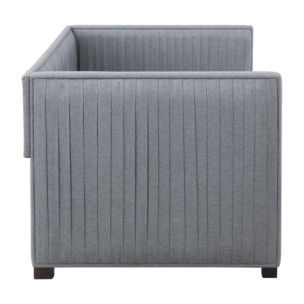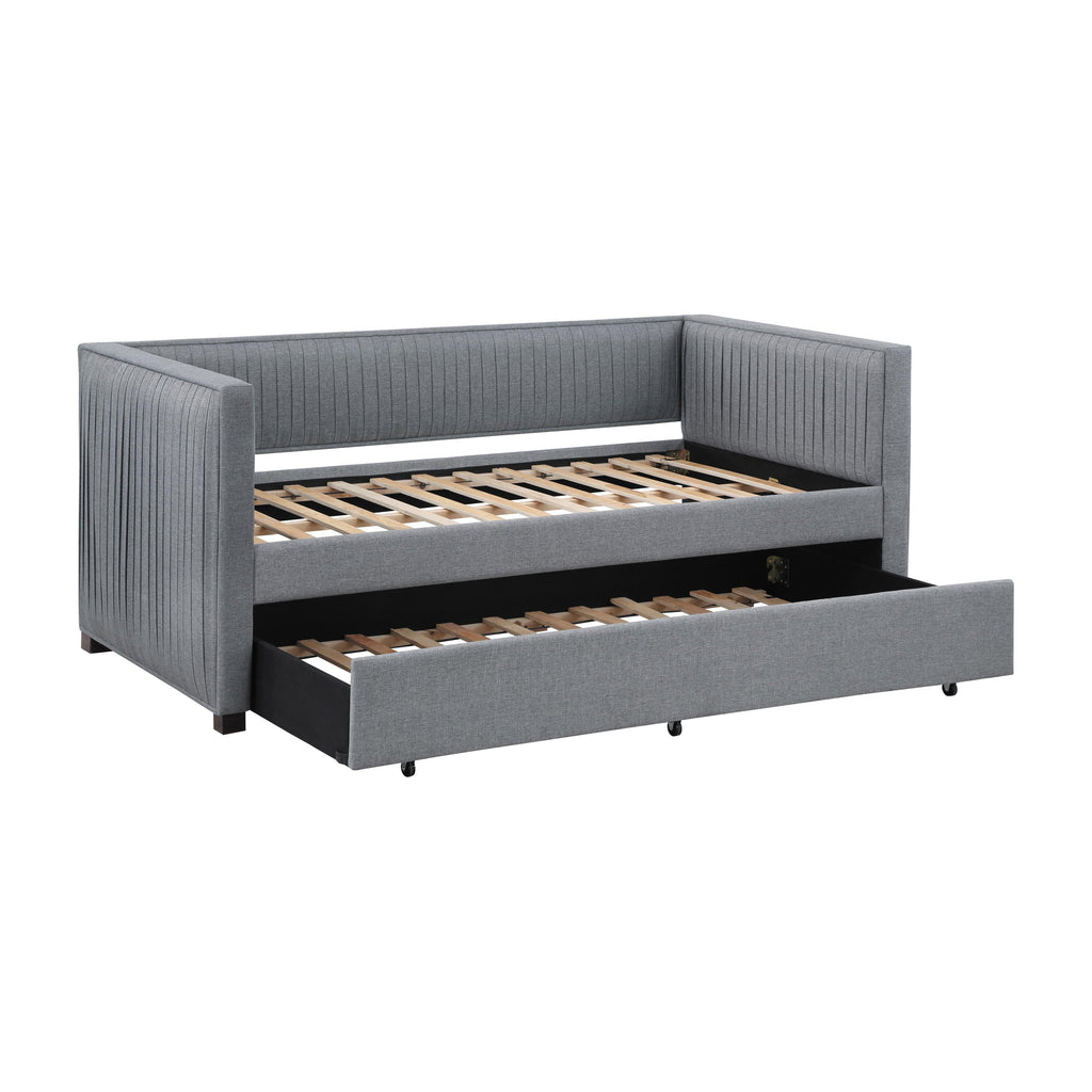 A gray fabric, pleated and overlapping along the surface of this twin daybed and trundle set, create a textured appearance against the clean straight lines. The narrow arms and backrest invite you to get creative with your own accent pillows and throws, opening this furniture piece up to becoming a lounge sofa or a bed for additional overnight guests. A trundle slips beneath the main frame when not in use or can be retrieved and glided out effortlessly. Black finish feet add slight elevation and a pop of contrast against flooring and rugs too. This twin daybed trundle set is the perfect addition for compact, multipurpose spaces like home offices and guestrooms.