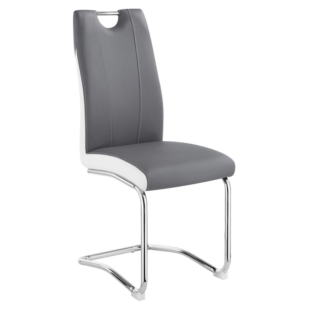 Give your entertainment area an ultra-modern feel with this five-piece dining table set. A spacious rectangular table with a gleaming high gloss white finish is supported by three stainless steel supports in a lustrous chrome finish that rest on a flush base that mirrors the top. With a pedestal-like design, the dining table invites each of the four cantilever style dining chairs to slide up for meals and conversations. Sit back and rest in the upholstered seats, wrapped in a two-tone gray and white leatherette that accents the contoured shapes. Mounted on a polished chrome metal base, the cantilever design chairs also offer an open, airy feel that showcases the table.