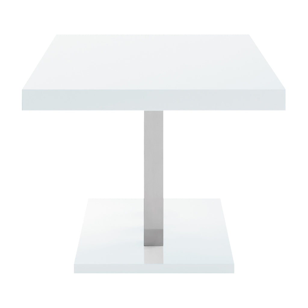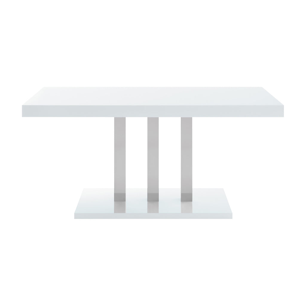 Sleek lines and smooth materials come together to create this ultra-modern dining table. Designed with a spacious rectangular top in a white high gloss finish that lends a polished, formal flair, this dining table offers up a chic style to formal entertaining spaces. Mirroring the top is a flush base, offering extra support and stability. With a pedestal-like design, the top and base come together with a trio of polished stainless steel supports in a lustrous and gleaming chrome finish. Place this dining table in a dining area for a jaw-dropping look.