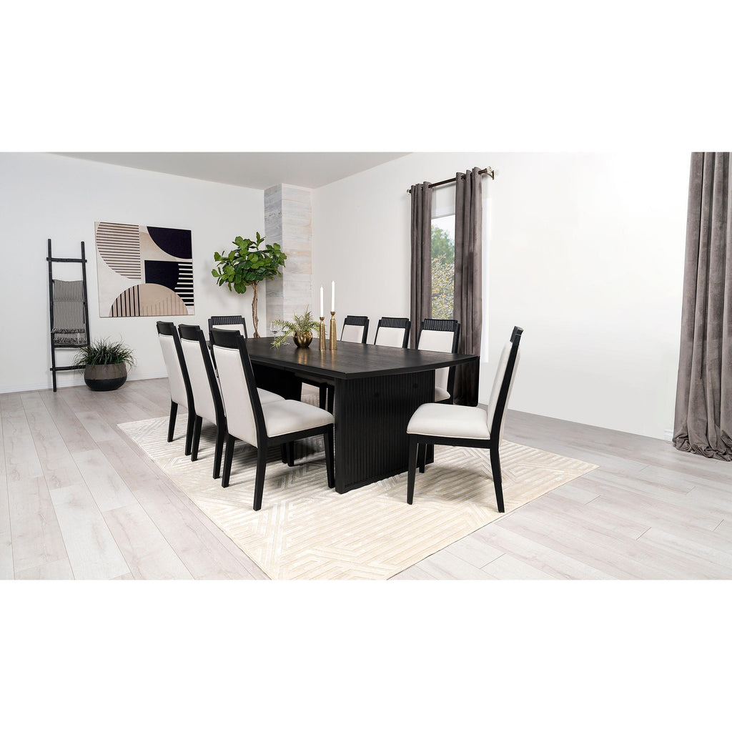 A notable color contrast and ultra-dramatic look make an impact in your modern or transitional dining space, creating a focal point worthy of consideration. This nine-piece wood and fabric dining set is adaptable to embellish a host of settings important to your everyday living. Distressed black finish wood construction on all pieces gains attention to a minimalist table design with straight, flat leg sections under a sleek top with linear silhouetting and a dimensional top chamfer curving along its edges. Chairs offer a clean silhouette with black finish wood framing, tapered legs, and ornate notched tops with linear carvings thrown in for extra dimension. Soft ivory fabric upholstery is intriguingly placed on both sides of top cushions and over a padded seat.