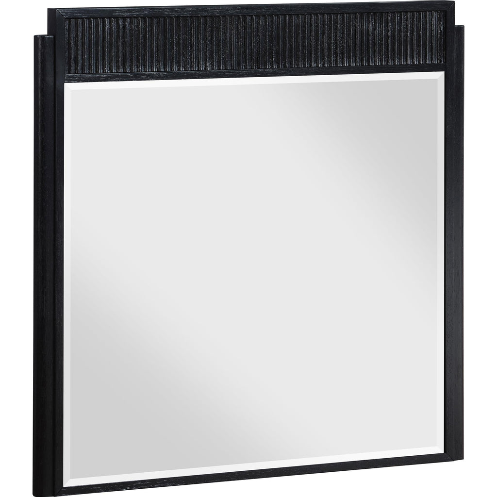 Ivory and black are complemented with gleaming gold in a sophisticated, modern five-piece bedroom set. Designed for elegance, it boasts a chic upholstered bed complete with vertical channel tufting that emphasizes its tall headboard and low footboard. While the bed sets an airy touch, the nightstand, dresser, and chest deliver abundant storage and stylish texture. Drawer fronts are complemented with fluted fronts and demi-lune pulls in a gleaming gold finish, offering refined character in any bedroom. The dresser includes a framed mirror, perfect for choosing jewelry and offering bright reflectivity.