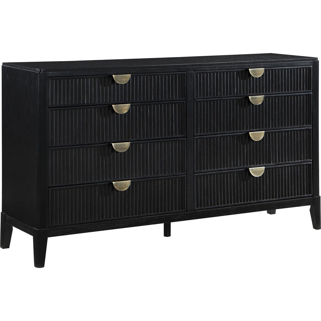 Ivory and black are complemented with gleaming gold in a sophisticated, modern five-piece bedroom set. Designed for elegance, it boasts a chic upholstered bed complete with vertical channel tufting that emphasizes its tall headboard and low footboard. While the bed sets an airy touch, the nightstand, dresser, and chest deliver abundant storage and stylish texture. Drawer fronts are complemented with fluted fronts and demi-lune pulls in a gleaming gold finish, offering refined character in any bedroom. The dresser includes a framed mirror, perfect for choosing jewelry and offering bright reflectivity.