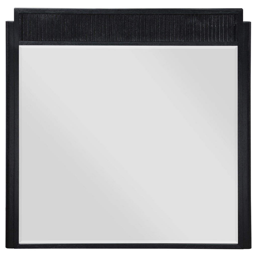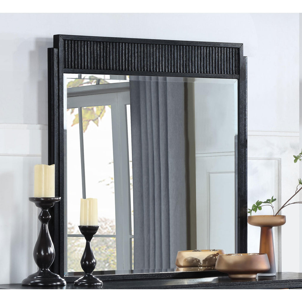 Complete your dresser with a stylish framed mirror. A perfect complement, it features a wooden frame complete with a fluted panel on top that adds rich depth and dimension. The mirror features a black finish with wire brushing that creates textural flair. Its center glass is beveled, creating a sense of depth in your bedroom. Use the mirror to brighten your bedroom and create a place for choosing jewelry or making last touch-ups to your look.