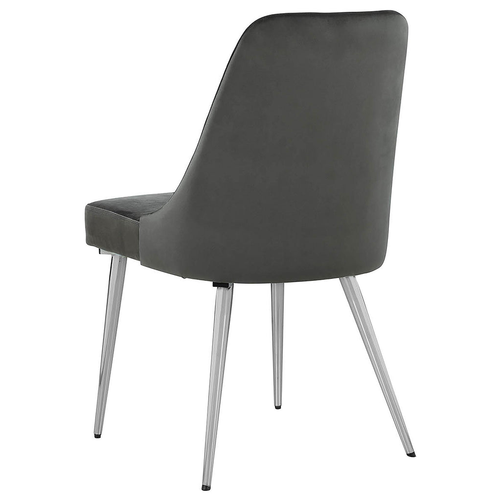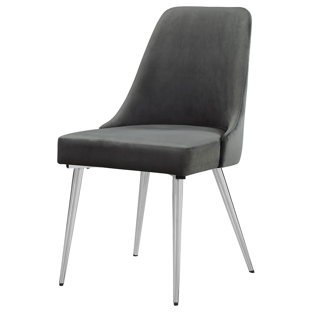 Keep guests and loved ones cozy as you gather together for delicious, home-cooked meals. This metal dining chair is impeccably crafted for the utmost comfort and support. Soft fabric upholstery covers a plush, padded seat for luxurious texture and a cloud-like feel. The legs are sleek and slightly angled to add drama to its silhouette. A curved seat back adds elements of fresh, modern style to this chic, stylish piece.