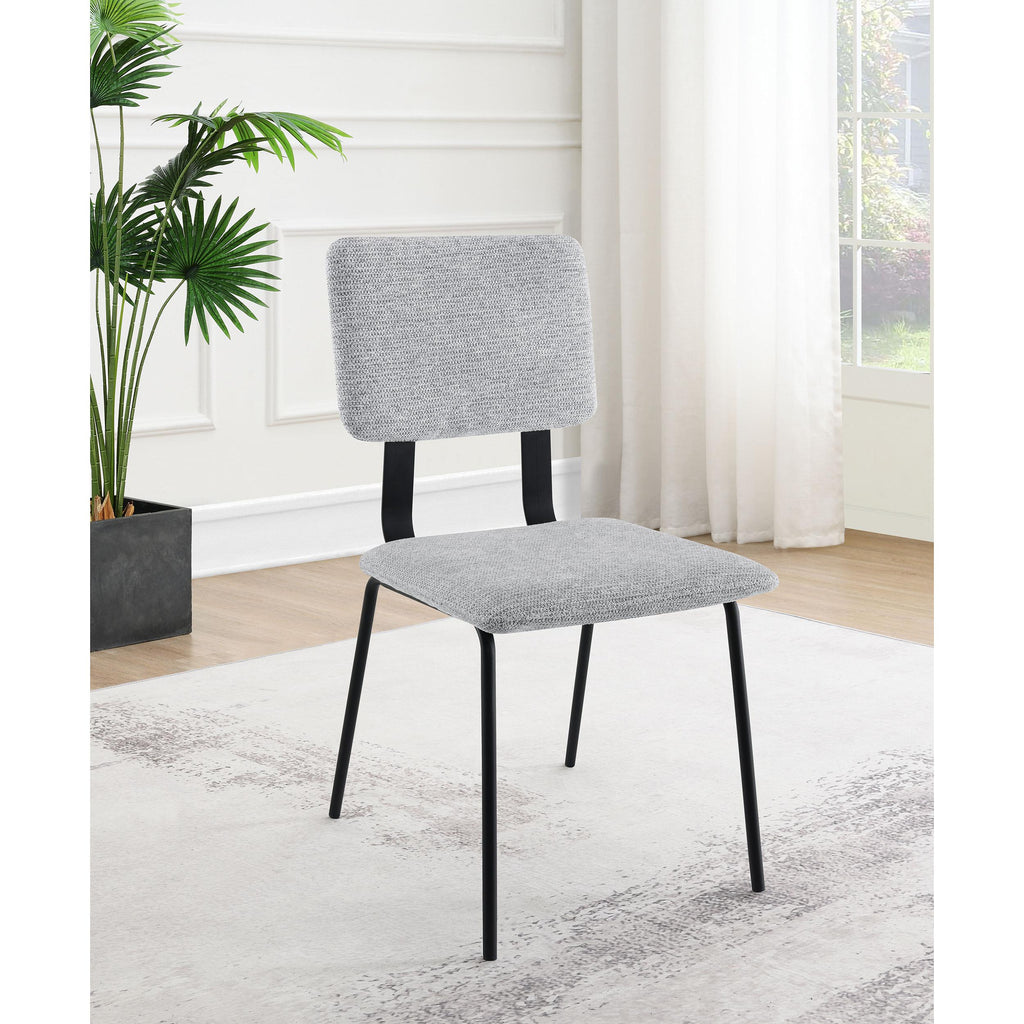 Reimagine your comfortable and inviting dining table with a set of two modern side chairs. Each features an armless profile with clean, slim lines for a versatile design. Sure to complement in a variety of settings, the chairs feature slim cushions with neutral upholstery that offers comfortable seating for friends and family. Each chair features a black finish base, complete with inverted U-shaped legs and thick back supports that add depth and contrast. Choose this set for a modern dining table in your kitchen or dining room.