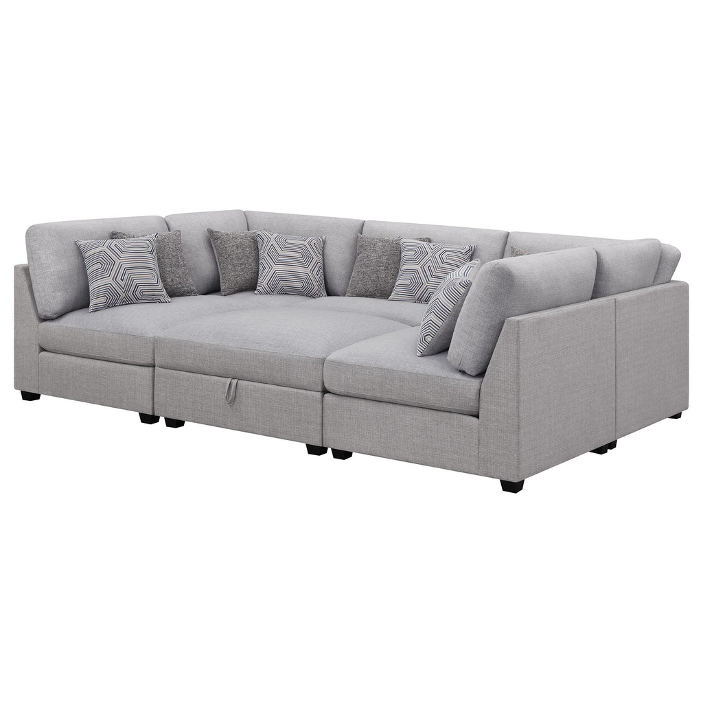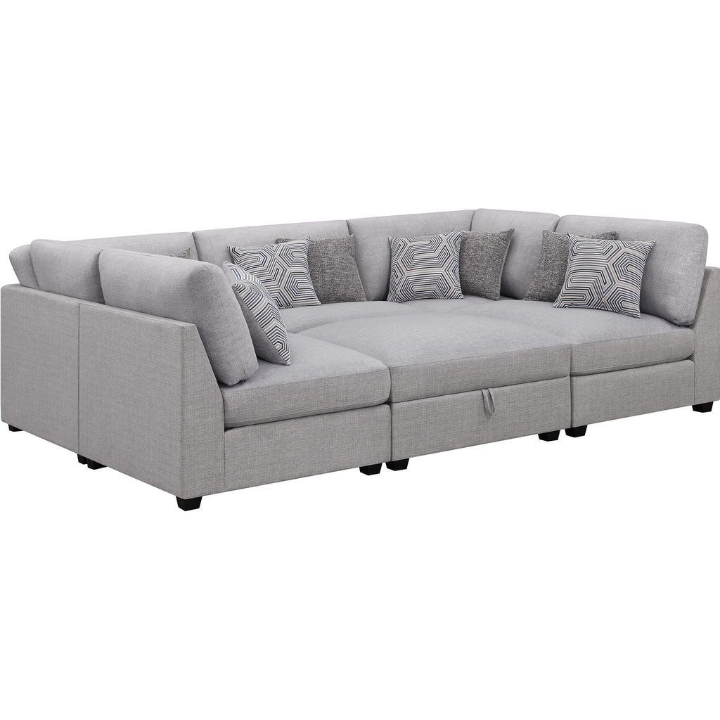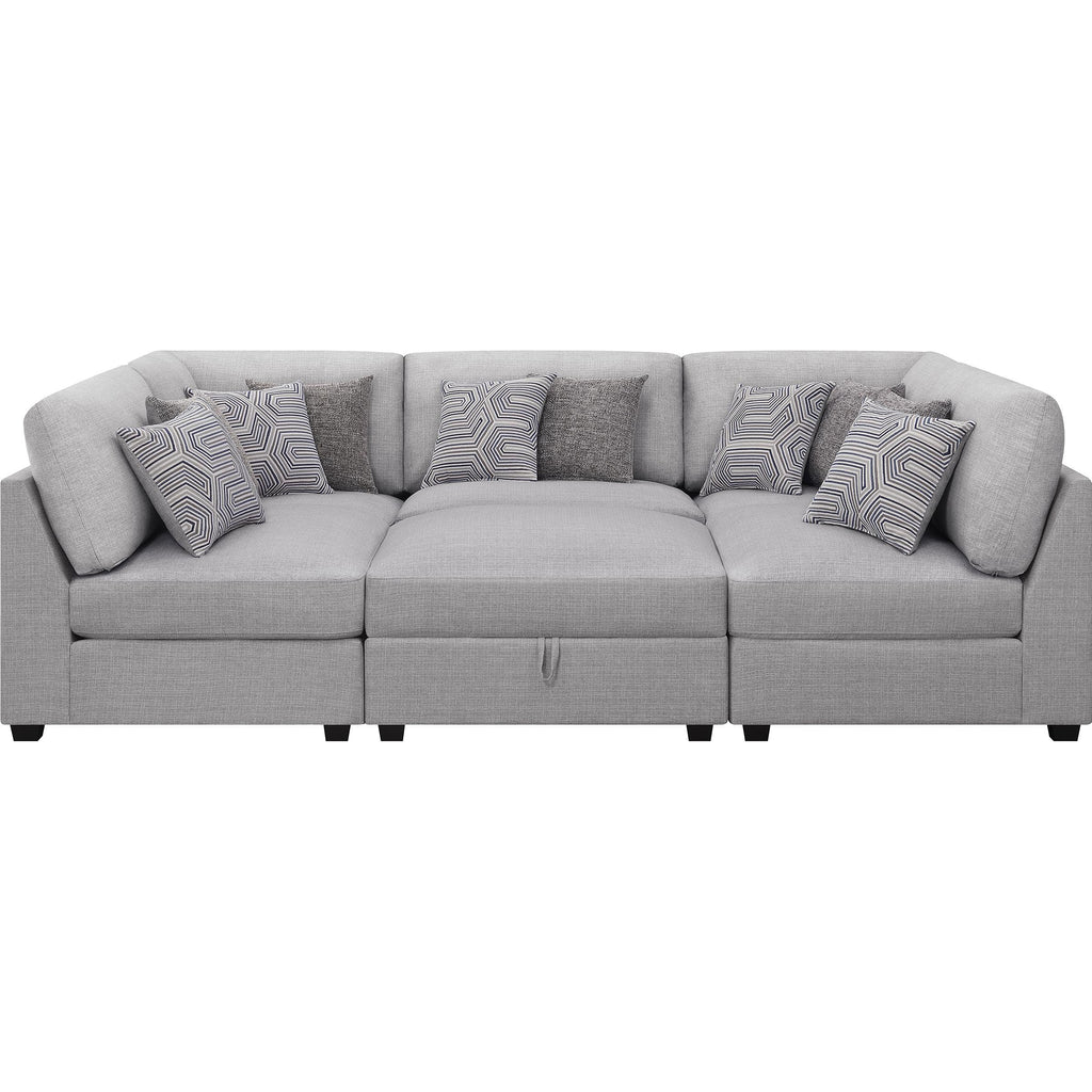 A generous modular sectional sofa delivers the perfect blend of on-trend style and impressive comfort. Designed for the whole family, the set includes a corner and four armless chairs complemented with a storage ottoman, all delivering the style and support you're looking for. Soft gray upholstery is a lovely complement to clean-lined design while smooth, tight cushions are outfitted with superior support and plush fill. The ottoman adds storage to the ensemble with a lift-top that reveals a roomy interior for all your odds and ends. Patterned accent pillows add dimension and tapered block feet provide dimension to ensure a sectional you'll love from every angle.