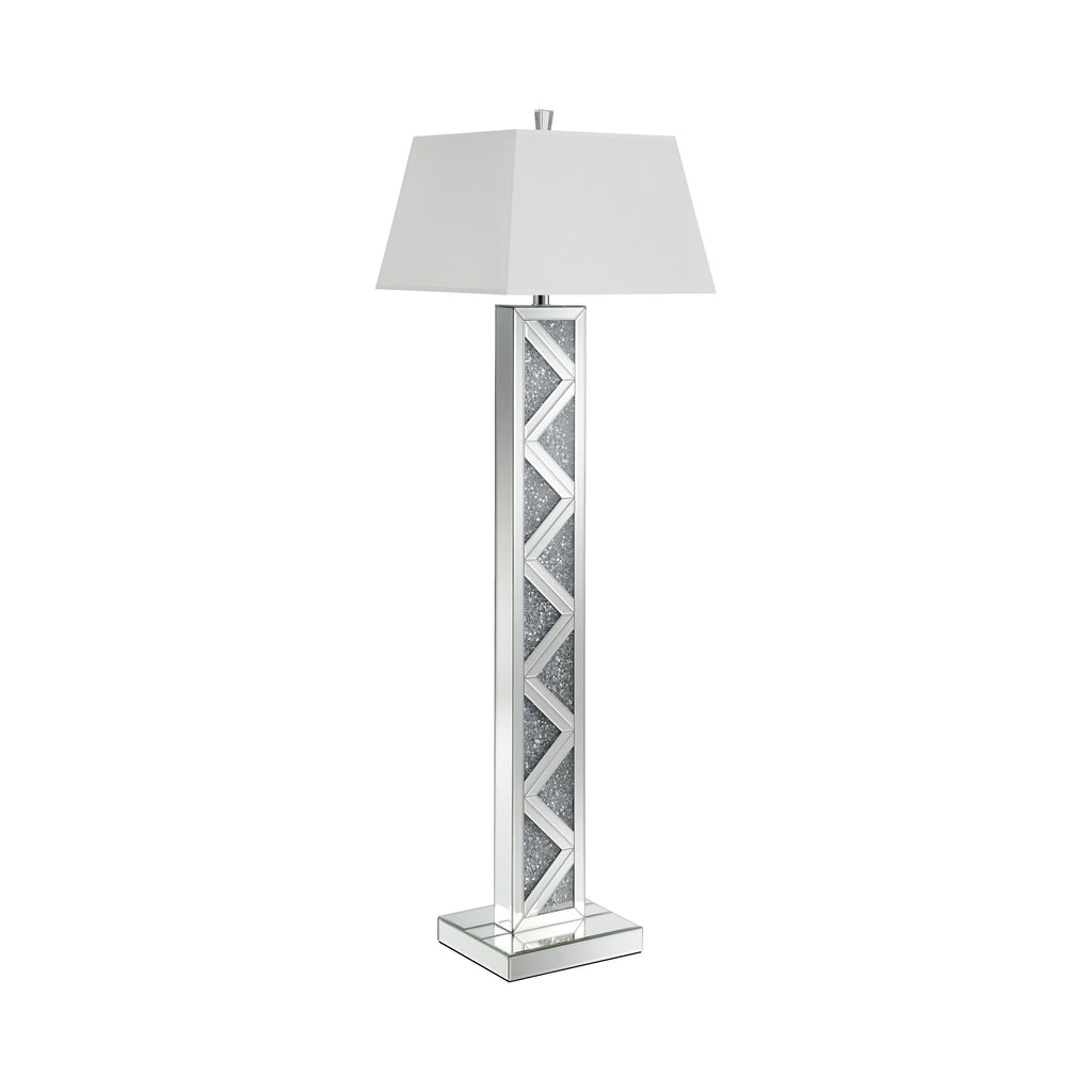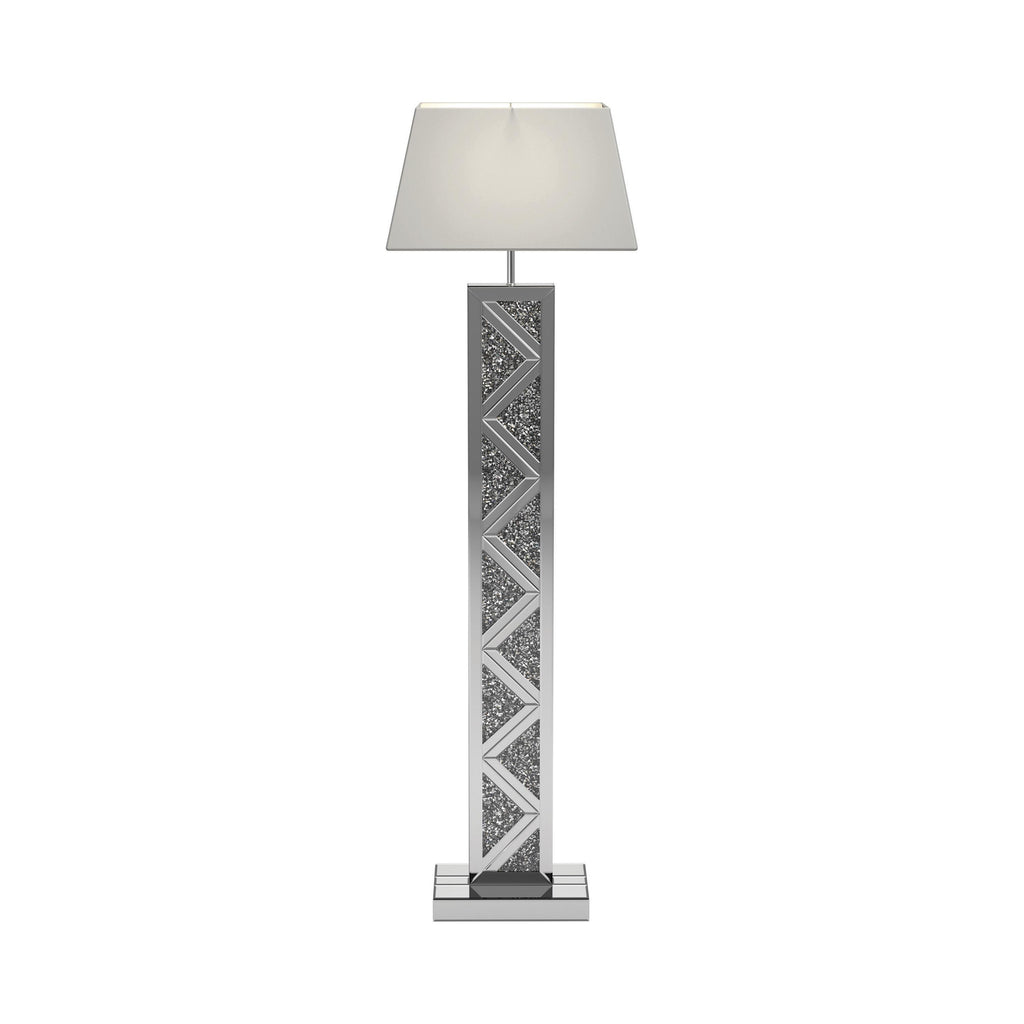 Open up your modern space with this floor lamp. Geometric design elements bring the contemporary nature of the piece to the forefront. Bright silver finish allows for easy matching with other pieces. Rectangular lampshade creates unique visual interest. Brightening up any contemporary or modern space is as easy as including this lamp.