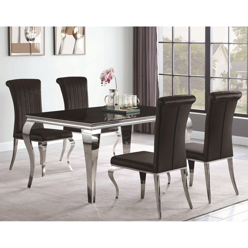 This contemporary Carone Dining Set by Coaster Furniture features an elegant set that will give a glam statement to your home. It has one glass top dining table with chromed cabriole legs and is matched with a black upholstered chair with knees legs in a chrome finish. This set includes four chairs and one table.
