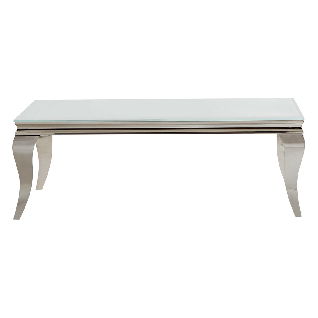 This coffee table showcases modern glam and functional sophistication with its tempered beveled glass top and polished stainless steel cabriole legs. The reflective finish and beautifully curved Queen Anne style legs offer a striking blend of timeless elegance and a majestic ambiance. Designed to enhance refined interiors, its ultra-modern aesthetic ensures both style and practicality. Smooth, easy-to-clean surfaces make this coffee table perfect for contemporary living spaces.