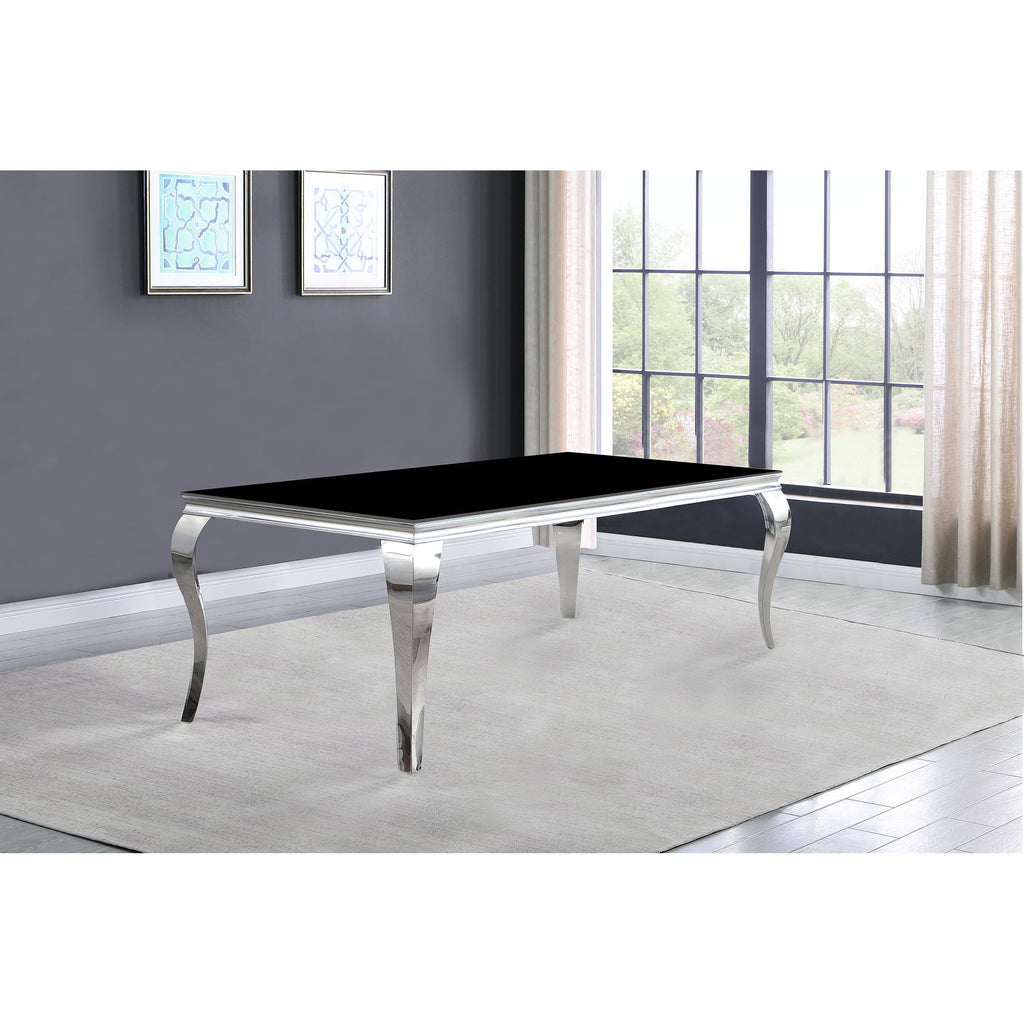 The Carone collection presents this dining room table that has a distinct modern design with touches of class and tradition. The table legs are made of stainless steel for panache. They are an eye-catching contrast to the table top with 12mm thick tempered glass, which also have beveled edges. The legs offer a curved appeal that's as stylish as traditional. This table fits nicely in a formal dining room as host to many a holiday feast.