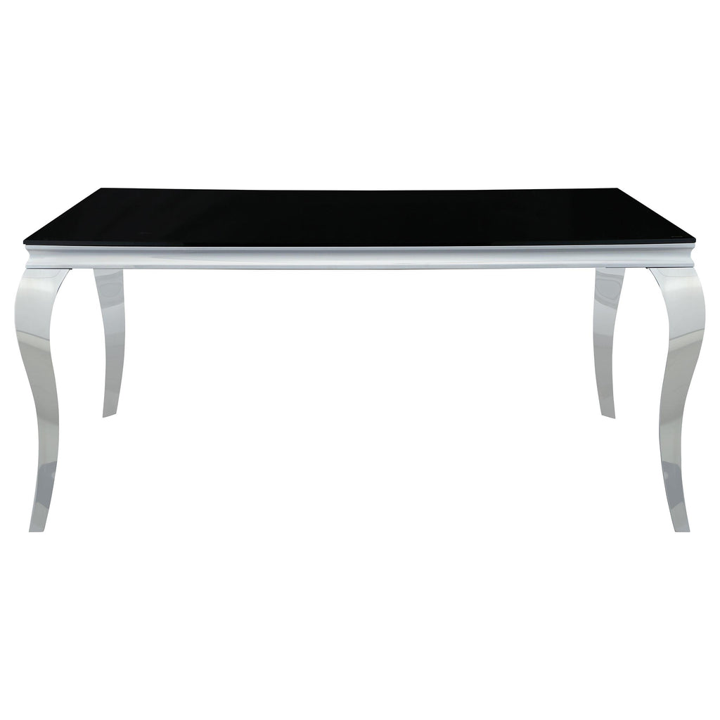 • Polished chrome finish table base features dramatically curved Cabriole legs topped with black tempered glass top
