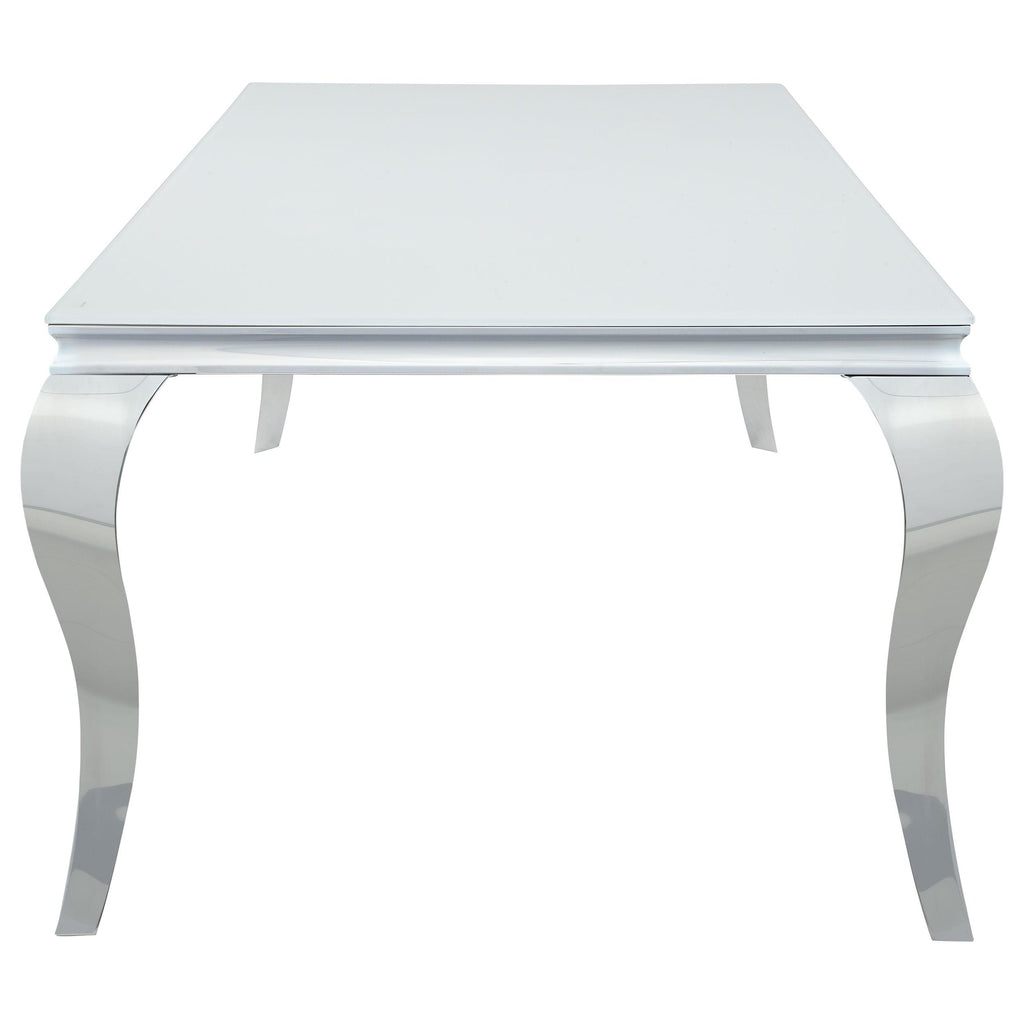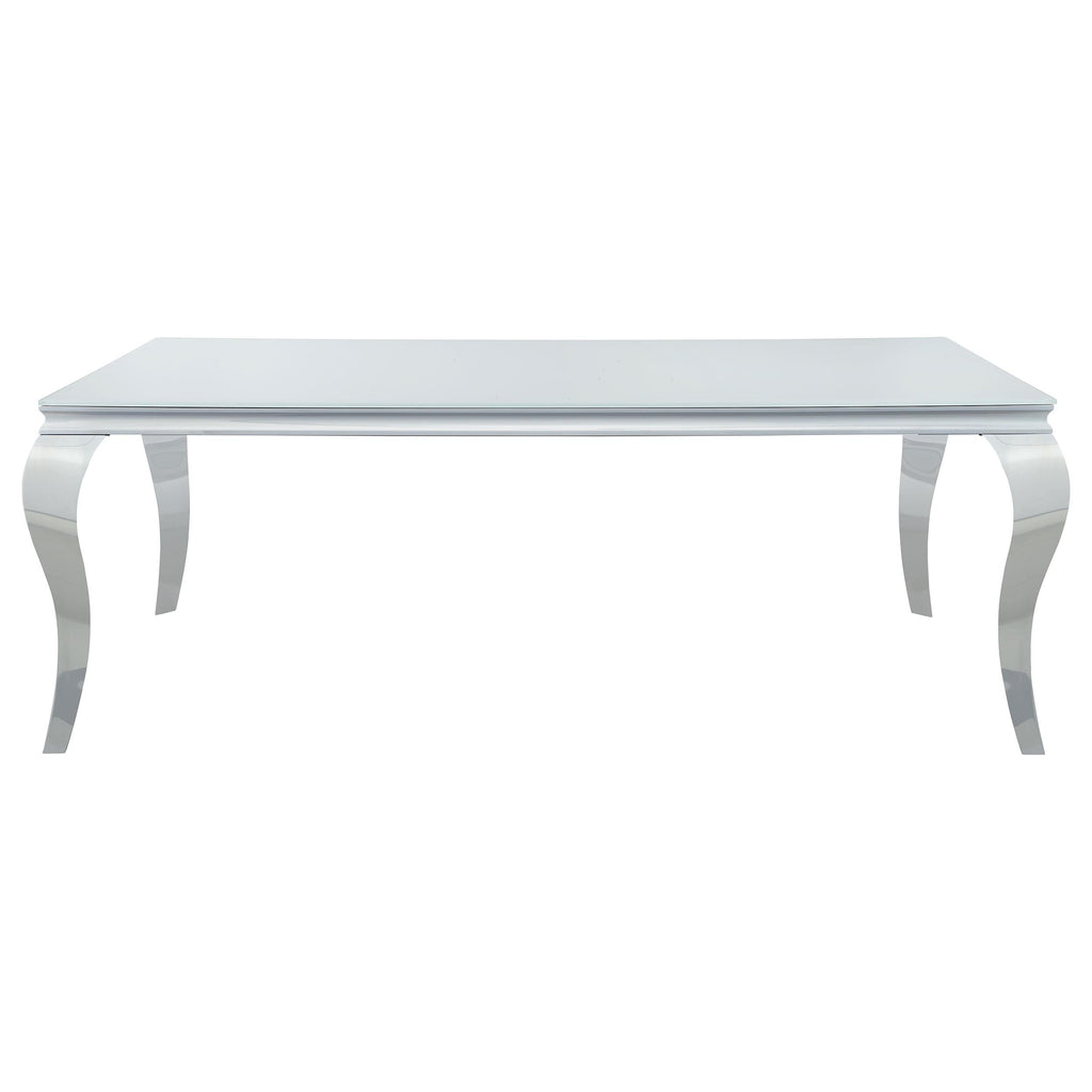 Glamorous with a luxurious touch, this elegant dining table makes the perfect addition to a formal dining space. With a mixed material design of durable stainless steel and glass, this dining table lends itself to several home decor styles. On each traditional Cabriole style leg is a gleaming chrome finish. Gather family and guests around the opaque tempered glass tabletop. In addition, this dining table seats six people comfortably.