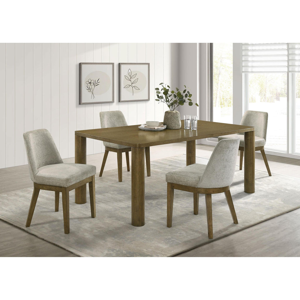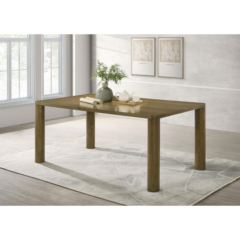 Create an inviting focal point in your dining room or breakfast nook with a modern wood dining table. Its rectangular profile is the ultimate in versatility, perfect for savoring meals with friends and family. A brown finish over oak veneer brings inviting natural character to the table, perfect for daily and special occasion enjoyment. The table boasts a simple silhouette, complete with a square edge and round post legs. The rounded corners of the tabletop soften the strong, robust look and feel of this charming table.