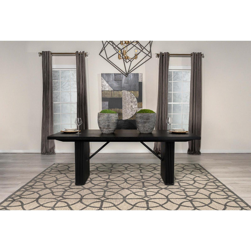 Make a bold statement with this stunning dining table. Its oak veneer top with a sleek black finish exudes elegance and modernity. The tambour base design steals the show with its captivating fluted patterns, showcased on the double pedestal legs. Embrace the perfect blend of style and functionality, as this table becomes the centerpiece of your dining space.