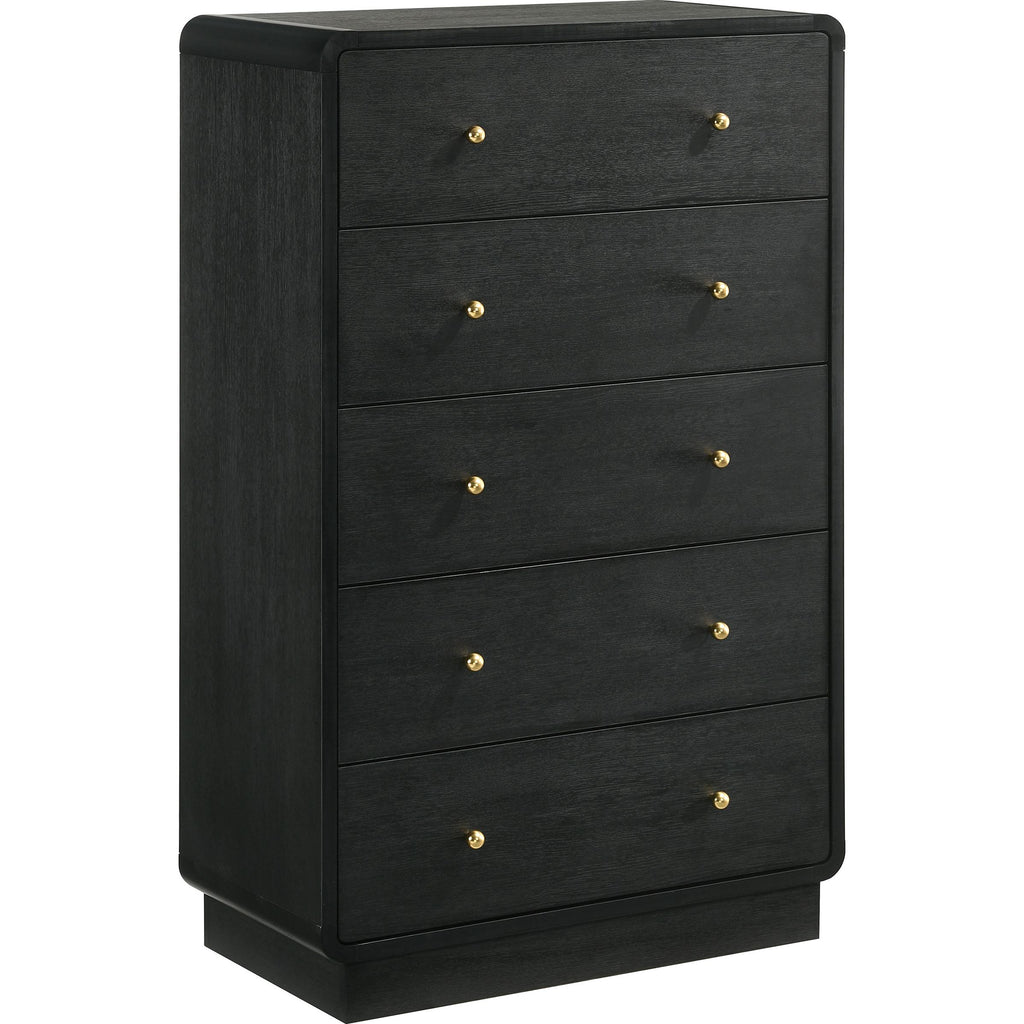 Reimagine your bedroom entirely with the sophistication of a modern bedroom set. It focuses on a chic upholstered bed that features a pair of padded panels with charcoal fabric that creates a soft, inviting presence that's perfect for lounging while maintaining a refined look. Storage pieces add ample space for organization. The dresser includes a mirror that lightens the look and provides reflectivity and a place for beauty rituals. A black finish is paired with old finish hardware, creating a touch of glam allure perfect for a sophisticated bedroom.