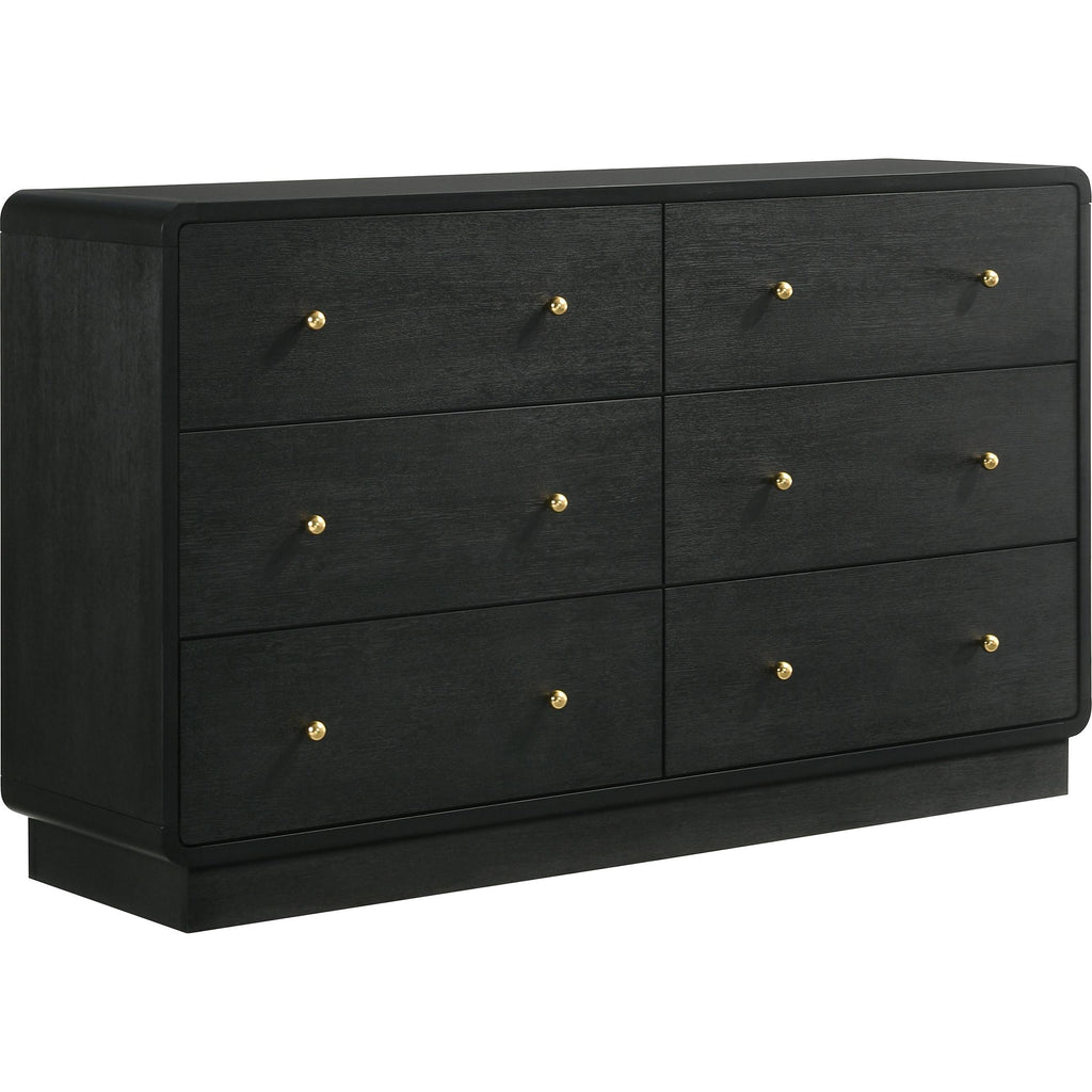 Reimagine your bedroom entirely with the sophistication of a modern bedroom set. It focuses on a chic upholstered bed that features a pair of padded panels with charcoal fabric that creates a soft, inviting presence that's perfect for lounging while maintaining a refined look. Storage pieces add ample space for organization. The dresser includes a mirror that lightens the look and provides reflectivity and a place for beauty rituals. A black finish is paired with old finish hardware, creating a touch of glam allure perfect for a sophisticated bedroom.