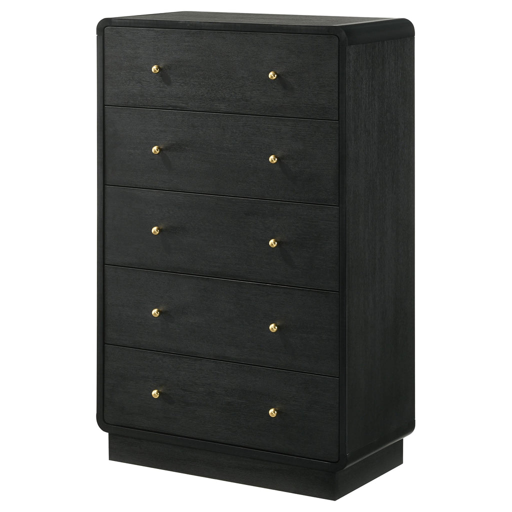 Create a dedicated space for clothing and accessory storage with this modern five-drawer chest. Its sophisticated presentation is complemented with a black finish over durable melamine surfaces, resisting damage to maintain its fresh, clean aesthetics. Each drawer front is dotted with a pair of ball knobs, offering seamless performance and a refined, glam touch of character. The chest features a rounded silhouette, softening the dark black finish, while adding to its modern appeal. Add art to its roomy top to create a truly eye-catching accent piece in your bedroom.