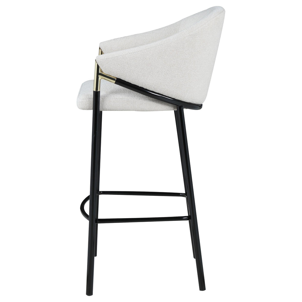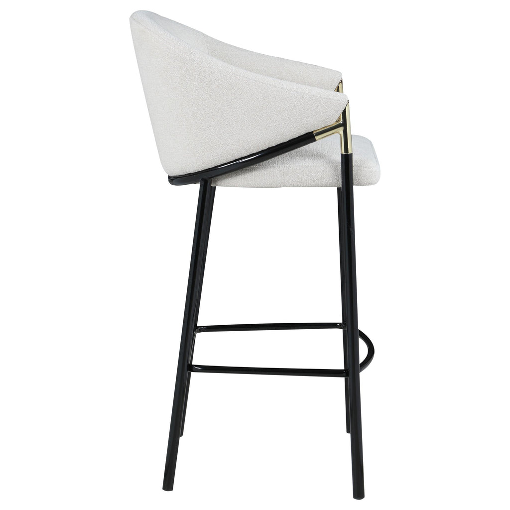 This pair of two stools offer a Hollywood regency look. With a tall and sleek design, the legs come in a glossy black finish that lends to many color palettes and offers a handsome look. Each stool has a cushioned seat, wrapped in a linen-like fabric that is soft to the touch. Plus, lean back and relax between sloped arm rests and a curved high back as you sip cocktails and chat with guests. Capping each arm rest is a gold accented piece that adds a glamorous touch.