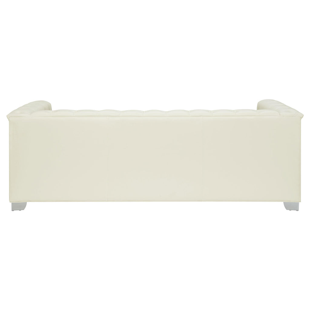 Transform your living room with chic, contemporary style. This stunning sofa is impeccably designed with a smooth, sleek silhouette. Upholstered in padded, breathable, pearl white leatherette, it exudes cool, comfortable glamour. Deep button tufting and chrome doorknocker handles give it a bold, modern edge. High-shine chrome legs pull its look together in stylish harmony.