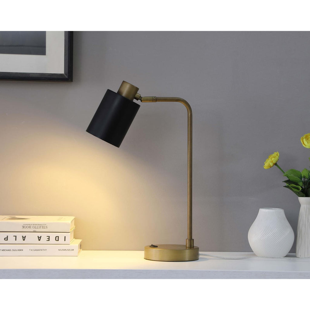 Upgrade your desk or nightstand with the charming style and energy efficient lighting of a modern metal LED table lamp. The classic design is updated for an on-trend look, pairing graceful curves with a minimalist look. The cylindrical metal shade houses a 2-watt bulb that's energy efficient and perfect for tasks. The shade receives a matte black finish that provides the perfect contrast to a lovely antique brass bold finish. Warm and welcoming, this desk lamp is the perfect choice for a refined library, den, or home office.