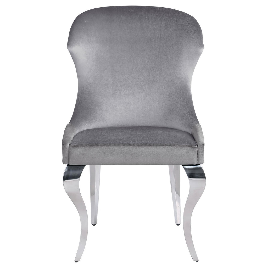 Indulge in the ultimate dining experience with the demi wing dining side chair. Its polished stainless steel cabriole legs exude sophistication, while the individually hand-driven nailhead trim adds a luxurious touch. Wrapped in soft velvet upholstery, this chair offers unparalleled comfort and elegance. Elevate your dining space with this exquisite blend of style and indulgence.