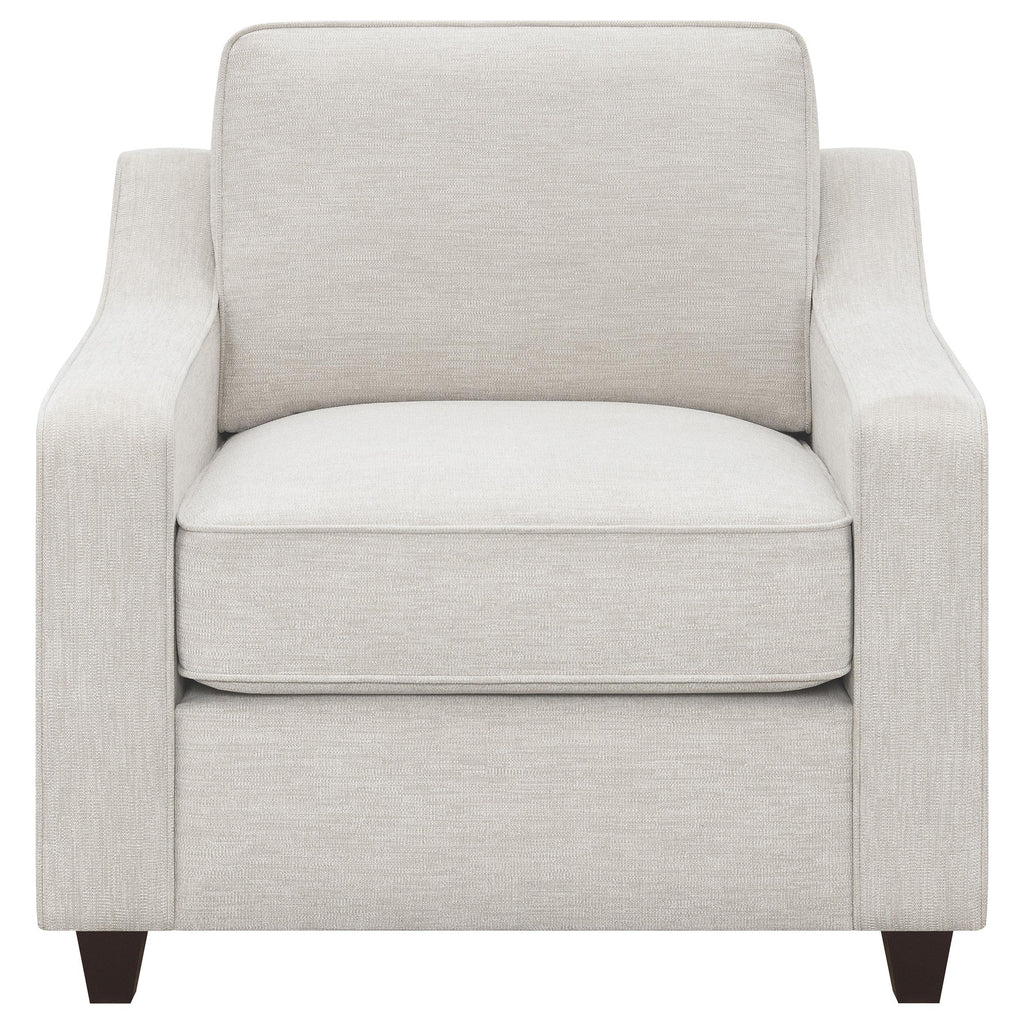 Upholstered in a bright beige woven chenille, this chair offers an understated, light and airy charm to any seating area. Sophisticated, sloped track arms and tapered dark brown legs lend a contrasting color palette, capable of blending with existing decor and color schemes. A boxed seat and back cushion lend a timeless design with classic welt details, creating small traditional touches. This contemporary chair is perfect for softening a corner in a transitional or farmhouse style home. In addition, it can be added alongside available matching furniture pieces, including a sofa and loveseat.
