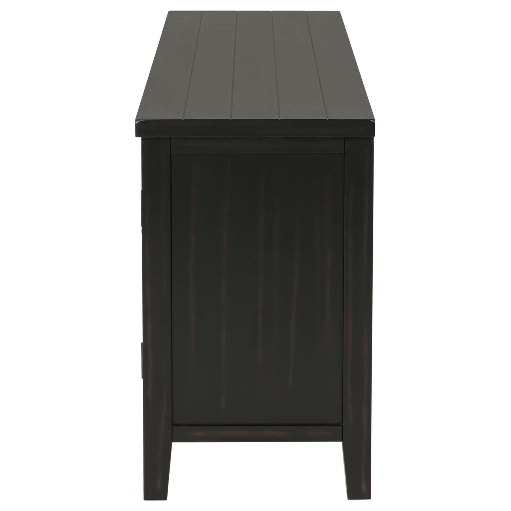 Upgrade your entertainment space with this stylish 60-inch TV stand, designed to accommodate TVs up to 65 inches. With two louvered doors, it combines classic charm with modern functionality, offering concealed storage for media equipment and accessories. The central open shelving provides easy access to devices, while cord management cutouts behind each compartment ensure a neat and organized setup. The rich wood finish, combined with a planked top, adds a touch of rustic sophistication to any room. Perfect as a TV stand, storage cabinet, or buffet, this versatile piece balances style and practicality in equal measure.