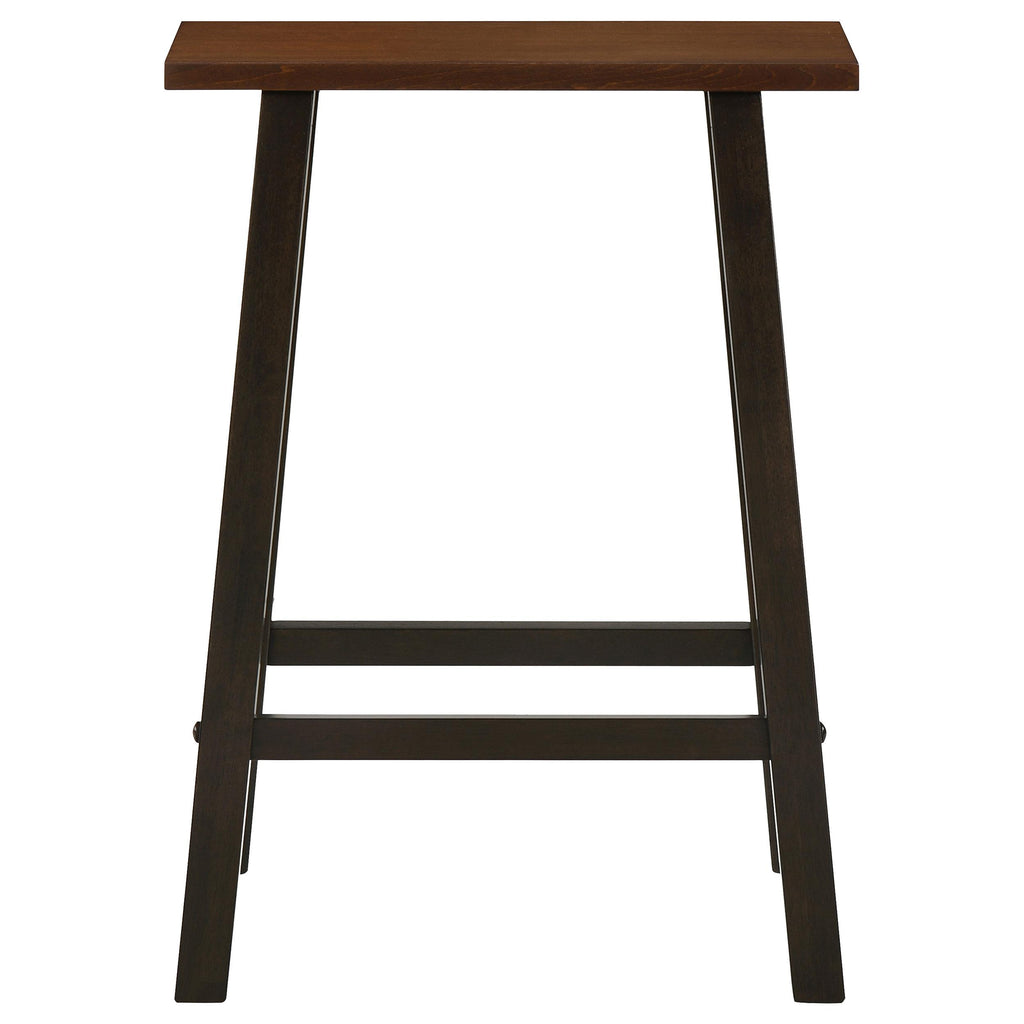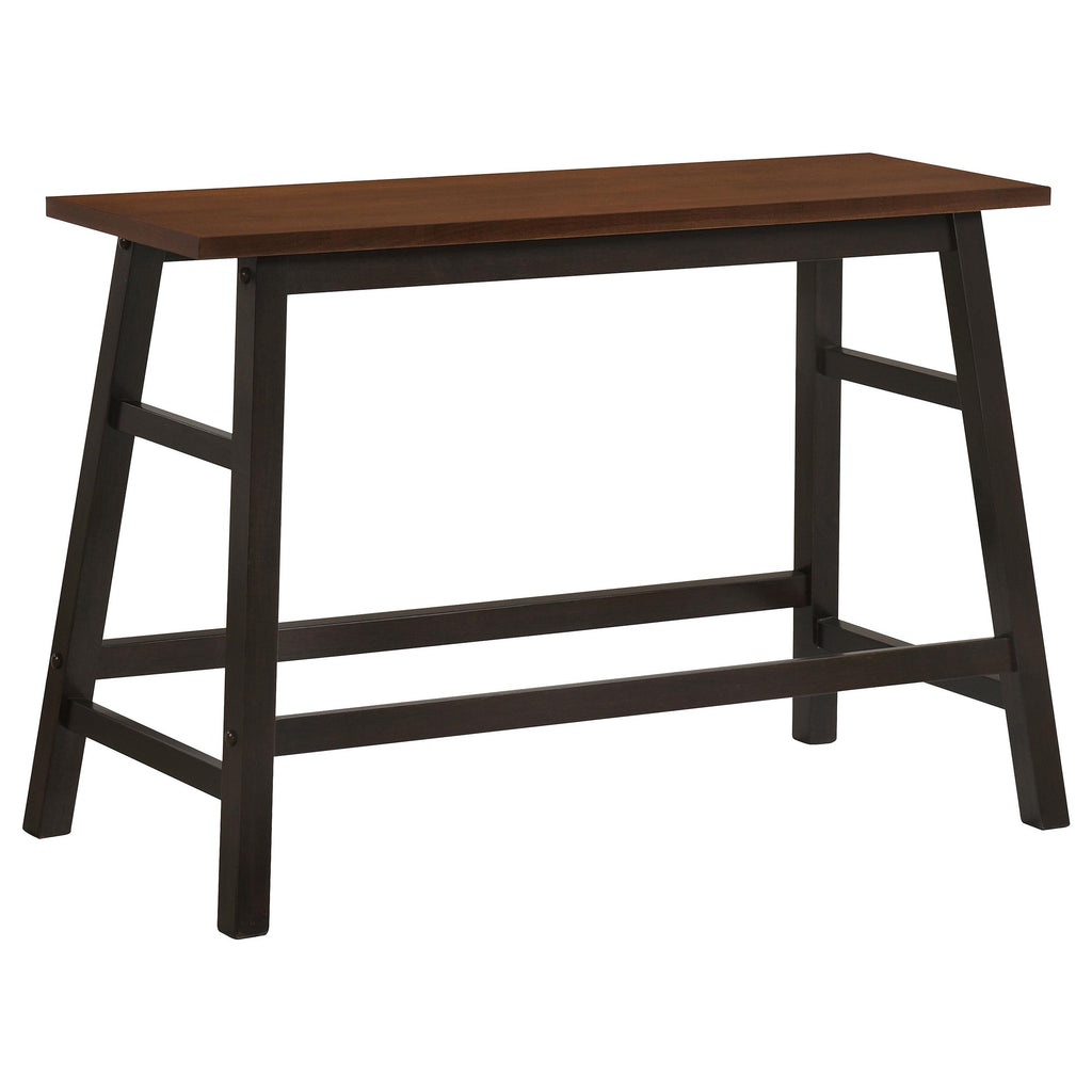 A charming addition to a kitchen breakfast nook or compact dining area, this country four-piece counter height table set gives off modern farmhouse vibes. A two-tone finish offers a subtle contrast and rustic-inspired design. A chestnut finish covers the tops of the table, stools and bench, as the rest on a bold, dark brown finish frame. The narrow rectangular counter height table features a trestle base and straight square legs for a clean lined effect. In addition, the two stools and bench also offer a similar style with square legs that flare out toward the feet and offer a footrest for extra support.