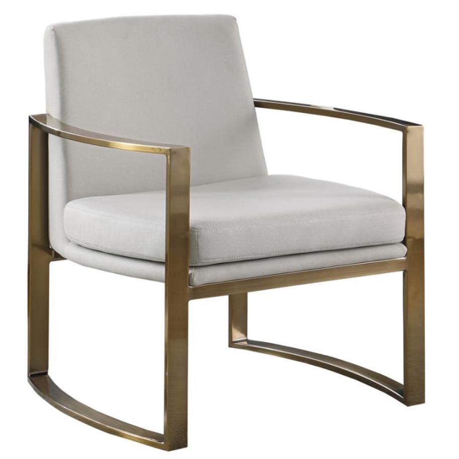 Strikingly modern and pleasing to the eye, this accent chair will perk up your living area. Concave armrests bring a supportive and comfortable seating experience. They boast a brushed bronze finish and add rich curvature to a classic silhouette. Padded cushioning makes a delightful addition to the textured leatherette upholstery. Sleek and clean, this modern accent chair is a dynamic addition to a living room seating area or a home office.
