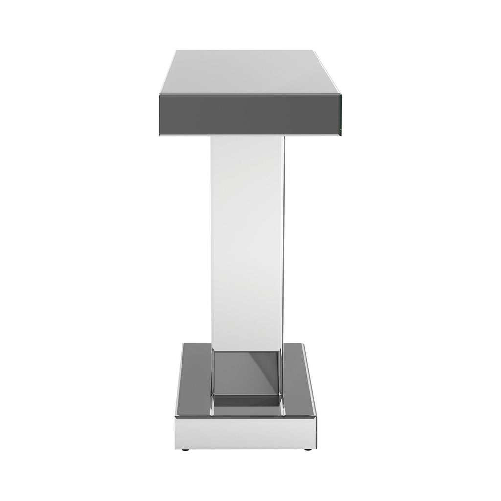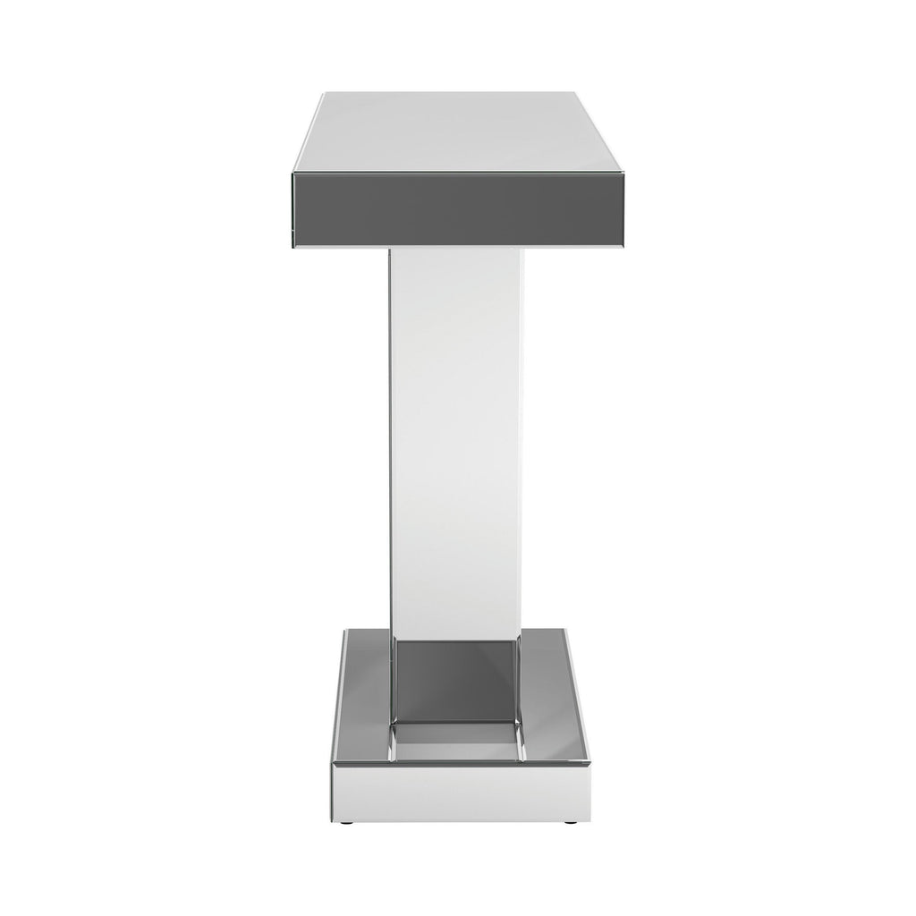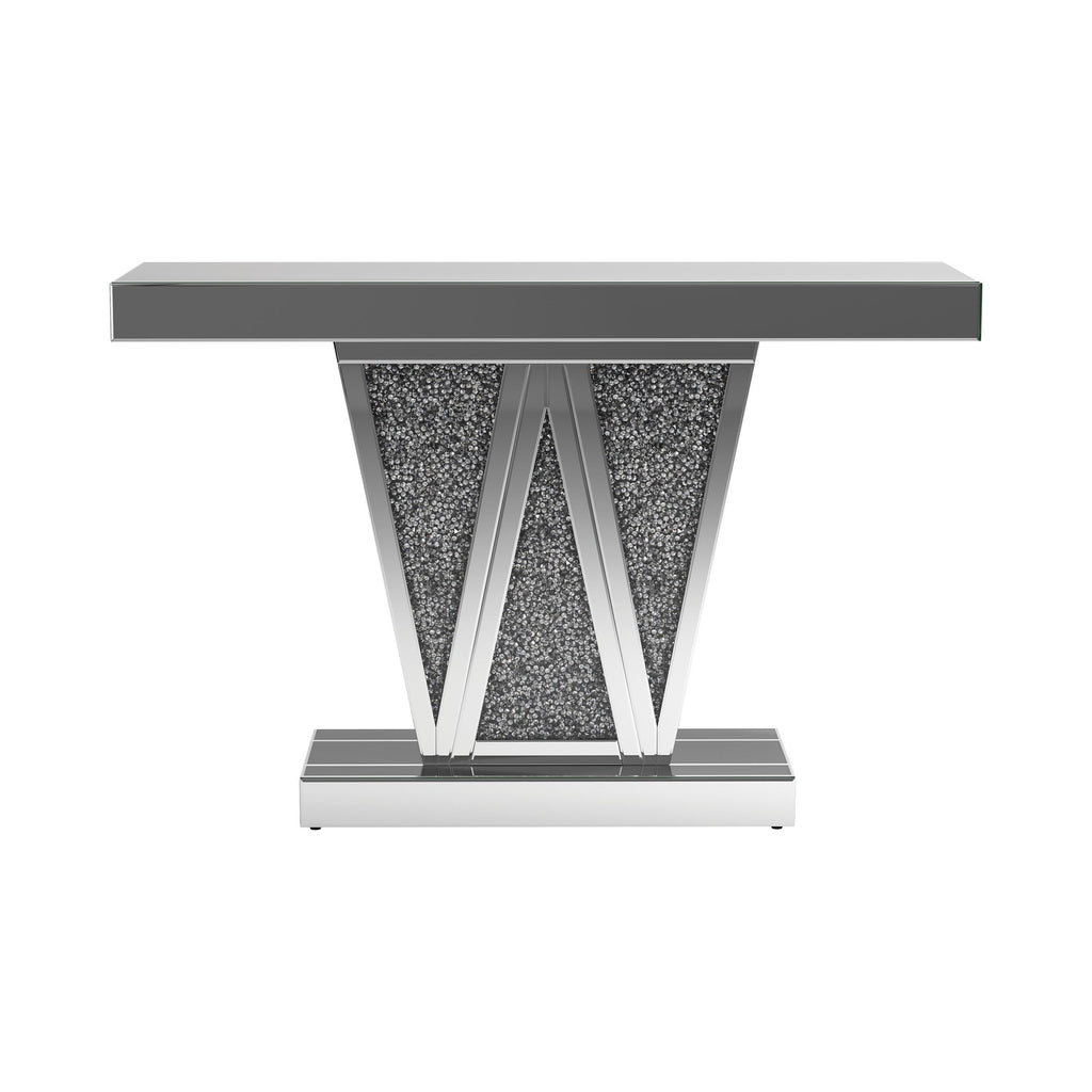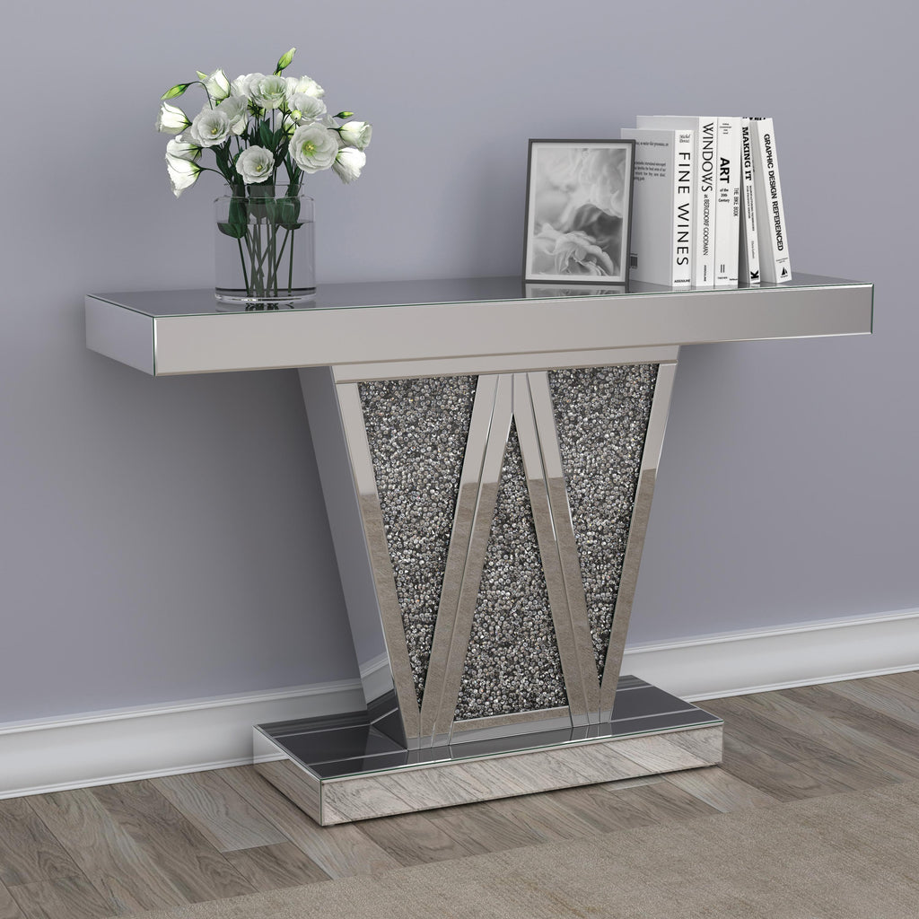 Entertain an elite crowd in your contemporary glam space with this silver console table. A geometric silhouette is enhanced by three triangular sections of the base, forming a W for added dimension in this contemporary console table. The silver finish showcases a glamorous look in any space. Equally at home in a glam dining room or a contemporary entertaining space, this console table gives that rockstar vibe. Top with a sculptural art piece for a striking accent to spark conversation.