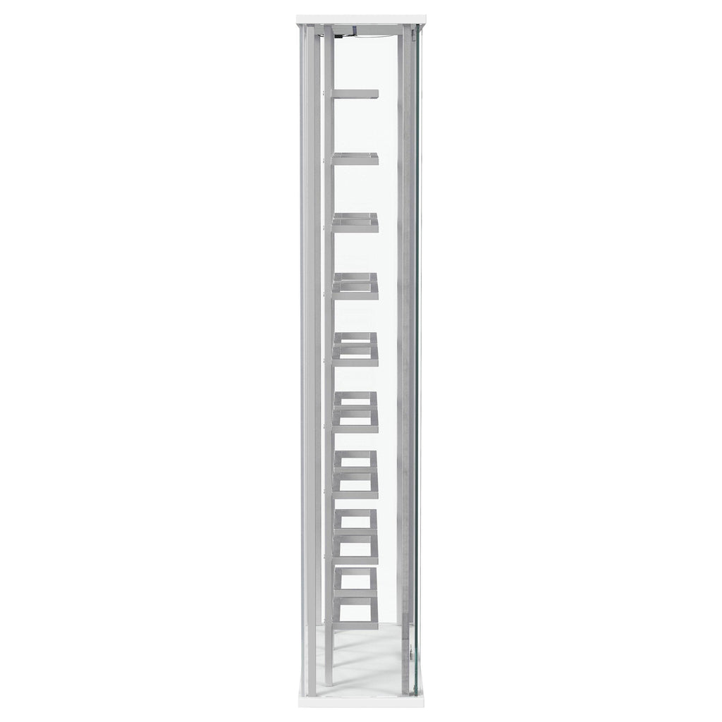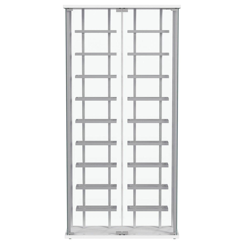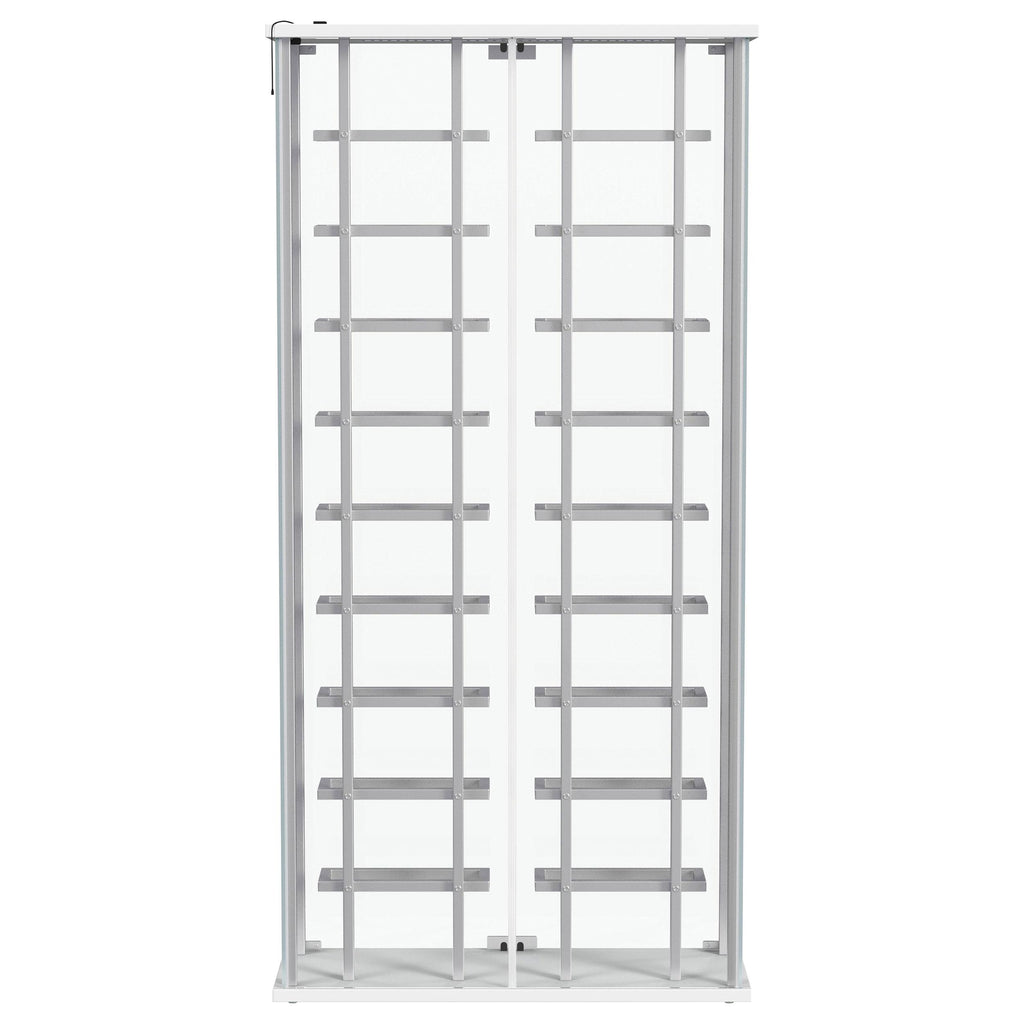 Put the spotlight - literally - on your favorite vintages with a modern bar cabinet. The glass cabinet is crystal clear with built-in LED lighting, offering bright, open flair in your dining room or home lounge. The cabinet features two glass doors with chrome hardware, offering a matching look to interior shelving. Shelves hold up to 18 of your favorite bottles of wine, showing them off to their best effect. The LED light is operated with a touch switch, making it simple and easy to highlight prized vintages.