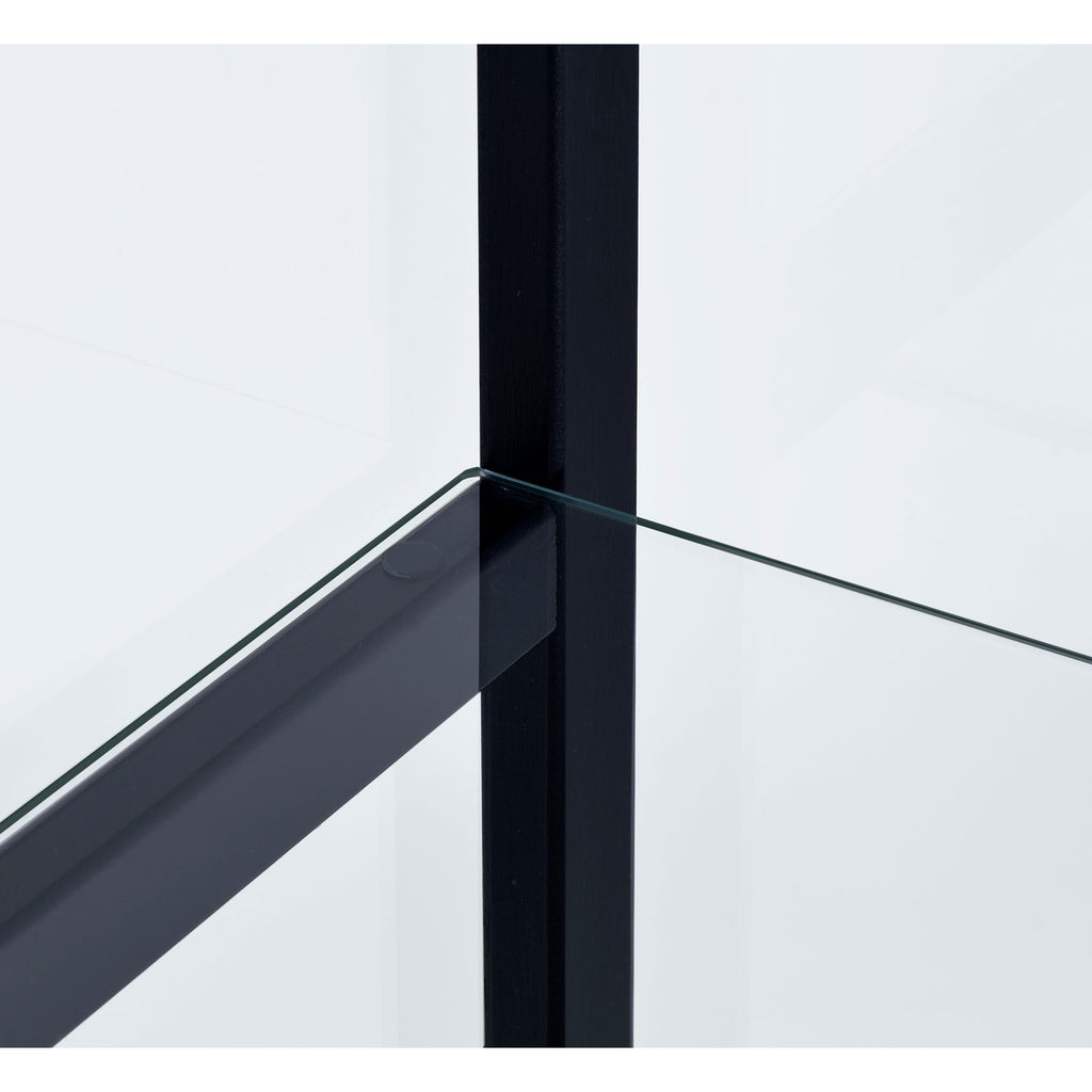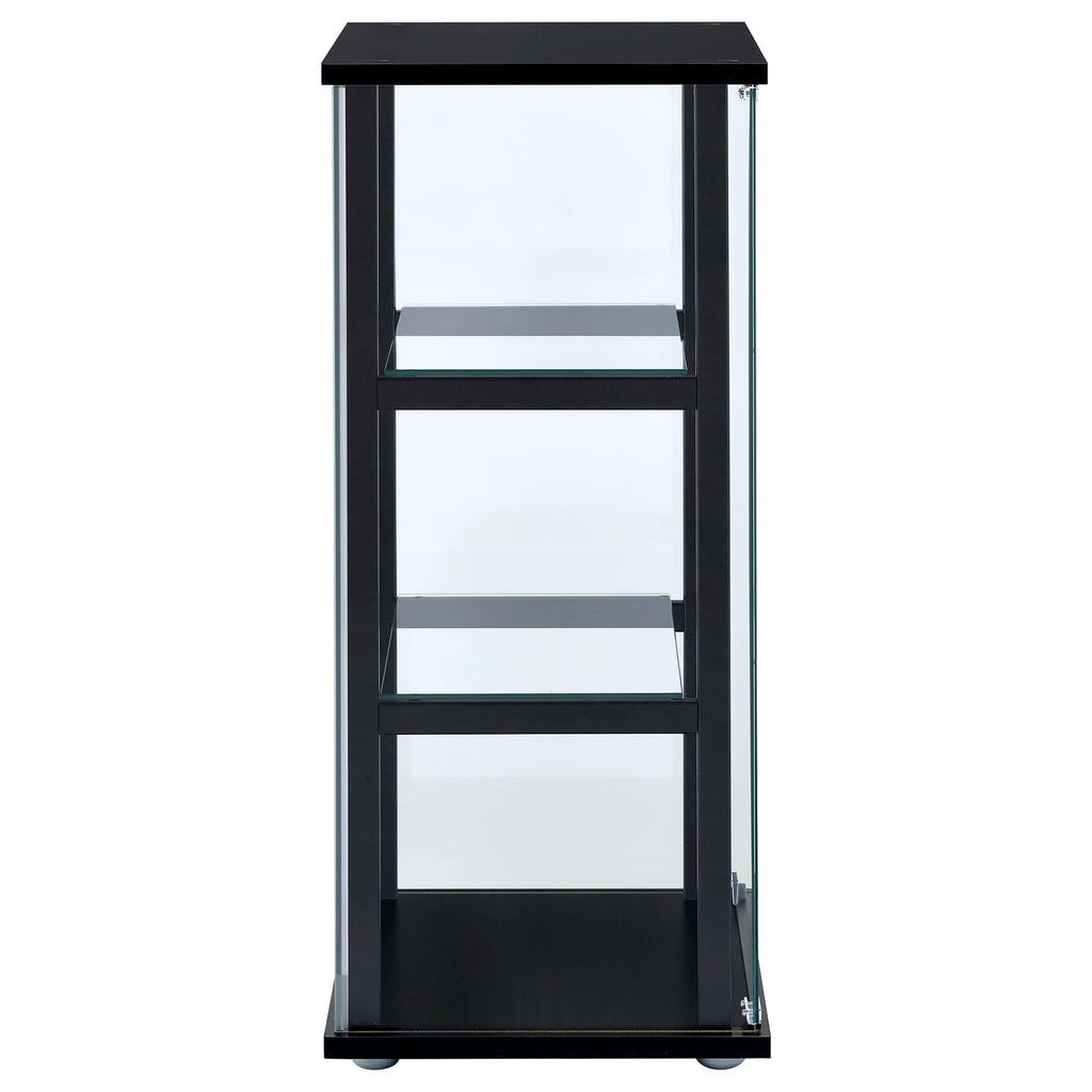 A modern version of a true classic makes a fabulous addition to a transitional space. With linear styling and a fresh look, this curio cabinet offers a perfect venue for showcasing treasured decor. Bold black tops a simple frame, top, and base. Tempered glass shelves create transparent space for display. Access its interior easily with push-to-open doors.