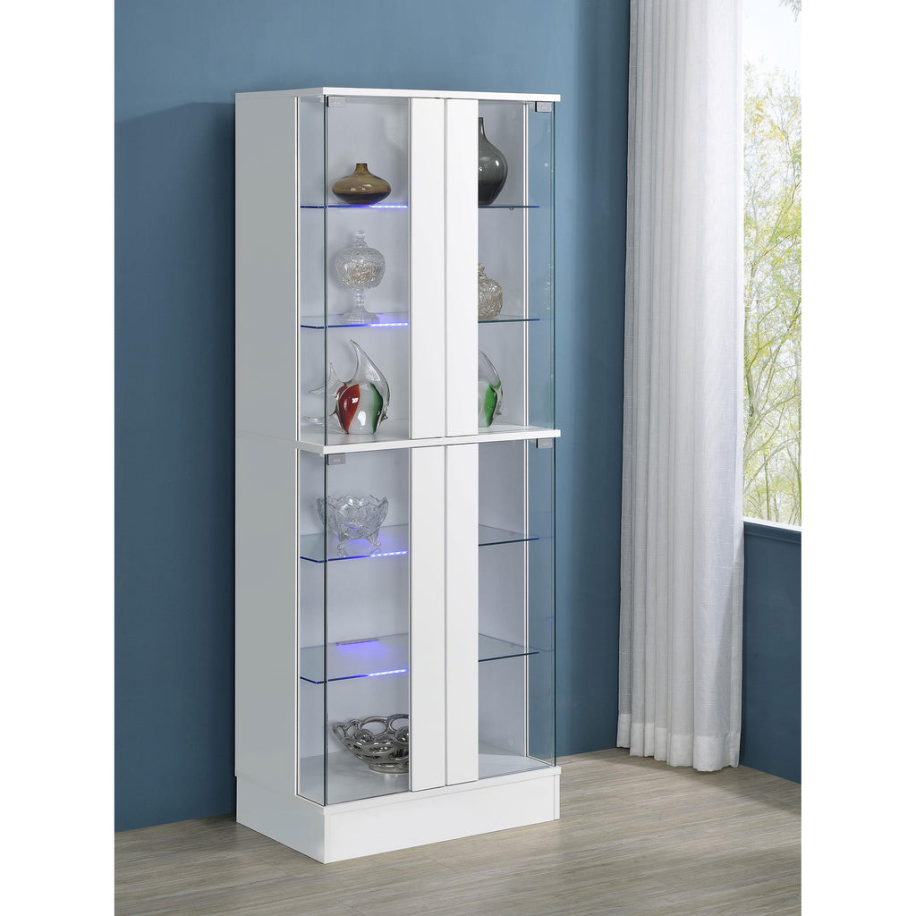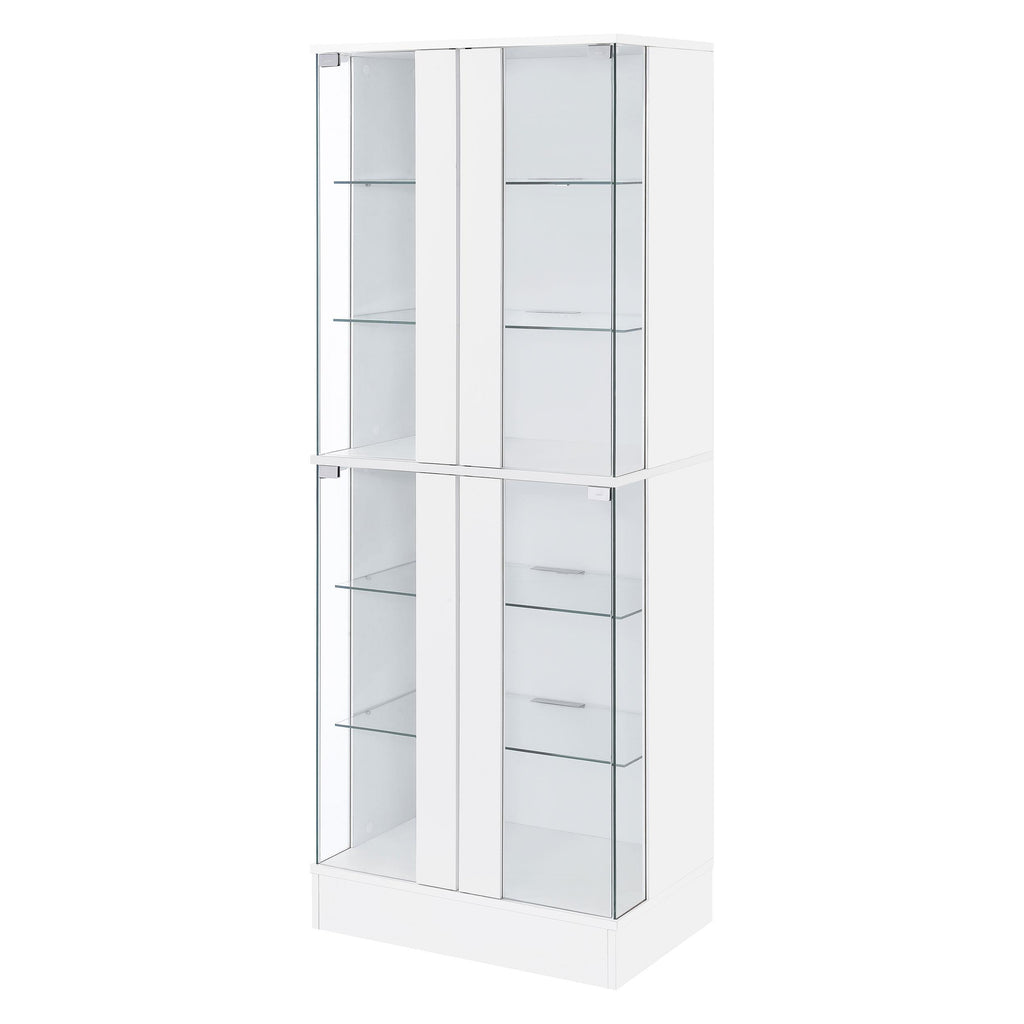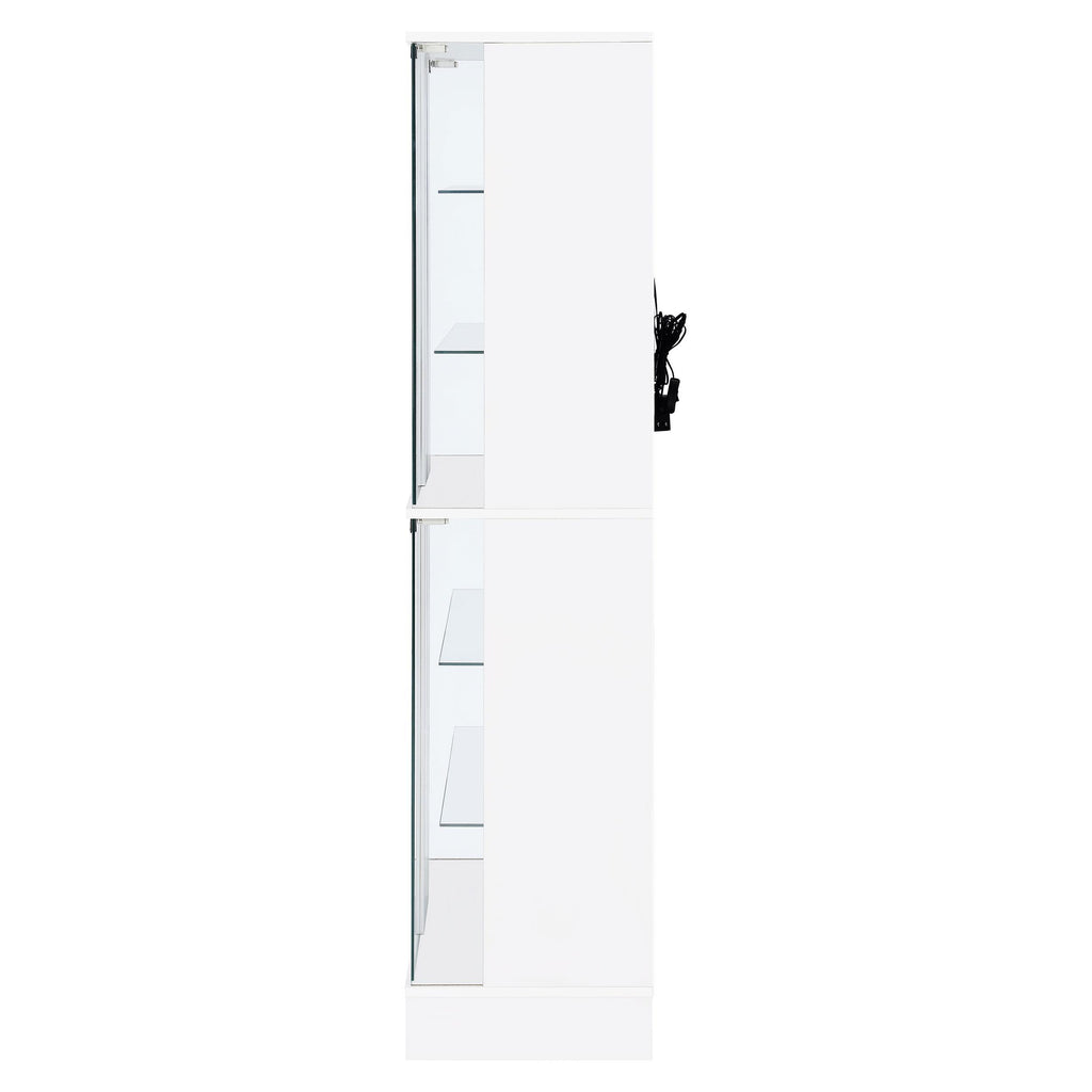 Discover sophistication and functionality fused in this sleek curio display cabinet, a stylish centerpiece for any room. The high gloss laminate on engineered wood gives a luminous sheen, complemented by clear tempered glass doors that encase six tiers of shelving. Each shelf basks in the glow of integrated LED lights, perfect for showcasing your treasures with a touch of modern elegance. The two-door design invites a clear view into your curated collection, while the robust construction promises longevity. This cabinet is not just furniture; it's a statement of refined taste and practical luxury.