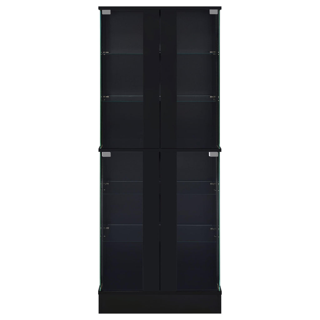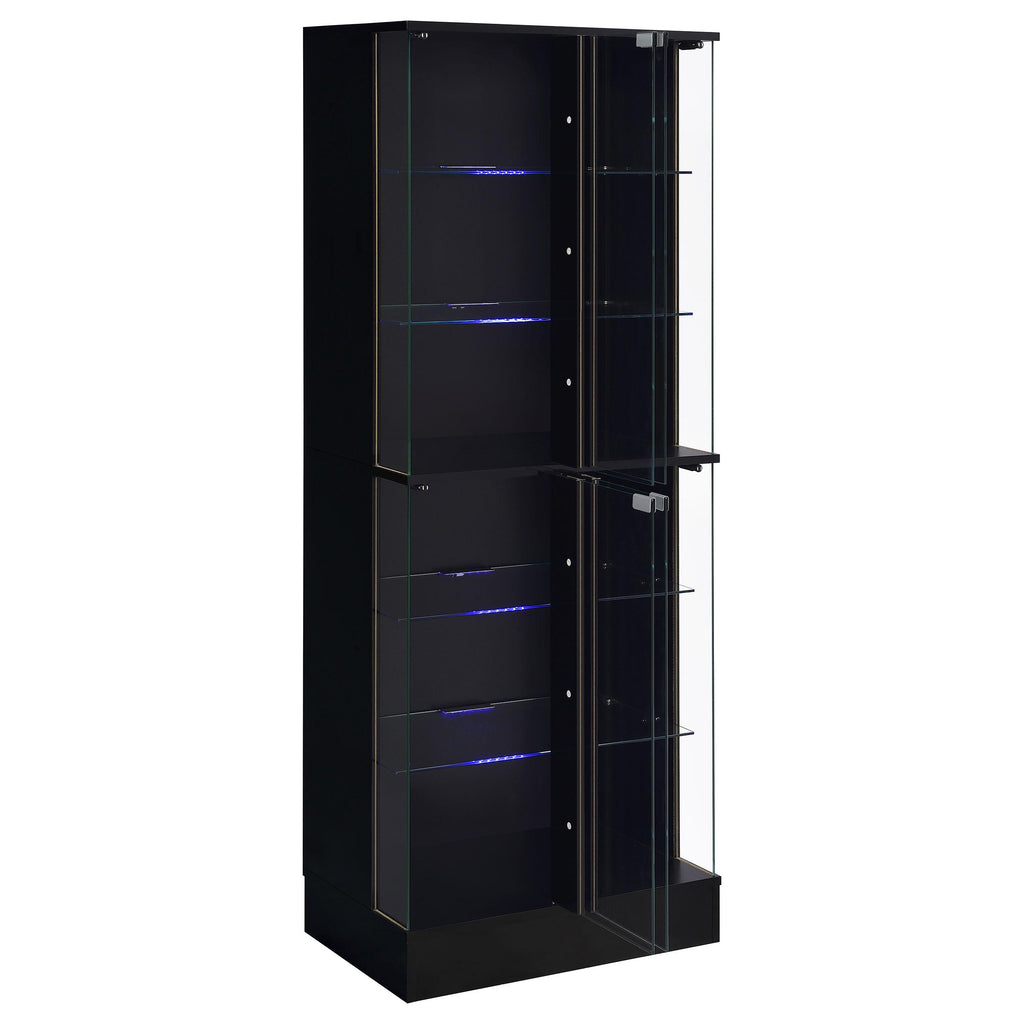 Discover sophistication and functionality fused in this sleek curio display cabinet, a stylish centerpiece for any room. The high gloss laminate on engineered wood gives a luminous sheen, complemented by clear tempered glass doors that encase six tiers of shelving. Each shelf basks in the glow of integrated LED lights, perfect for showcasing your treasures with a touch of modern elegance. The two-door design invites a clear view into your curated collection, while the robust construction promises longevity. This cabinet is not just furniture; it's a statement of refined taste and practical luxury.