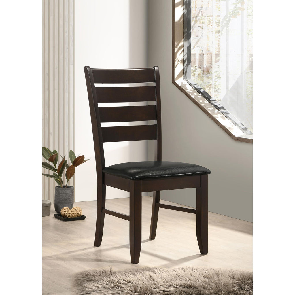 Part of the Dalila Collection, a casual wood dining chair pairs perfectly with dining table from the same collection. Seat back is flared and features four wide slats for a touch of character. Crafted from oak veneers and select hardwoods. Rich, warm cappuccino finish. Seat comfortably padded in brown vinyl for long nights of backgammon or finishing a project.
