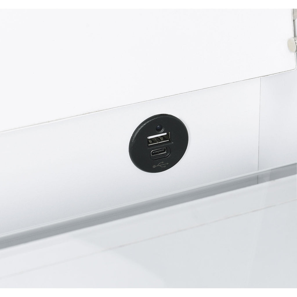 This high gloss makeup vanity set, crafted from engineered wood with eco-friendly laminate, blends seamlessly into your bedroom, doubling as a chic chest of drawers. The flip-top vanity mirror with LED lighting offers perfect illumination, while built-in dual USB outlets (Type A and Type C) allow for convenient device charging. The clear glass tabletop reveals a compartmentalized drawer for easy organization, and the cushioned vanity chair includes extra storage. Clear acrylic and chrome pull handles add a modern, elegant touch.