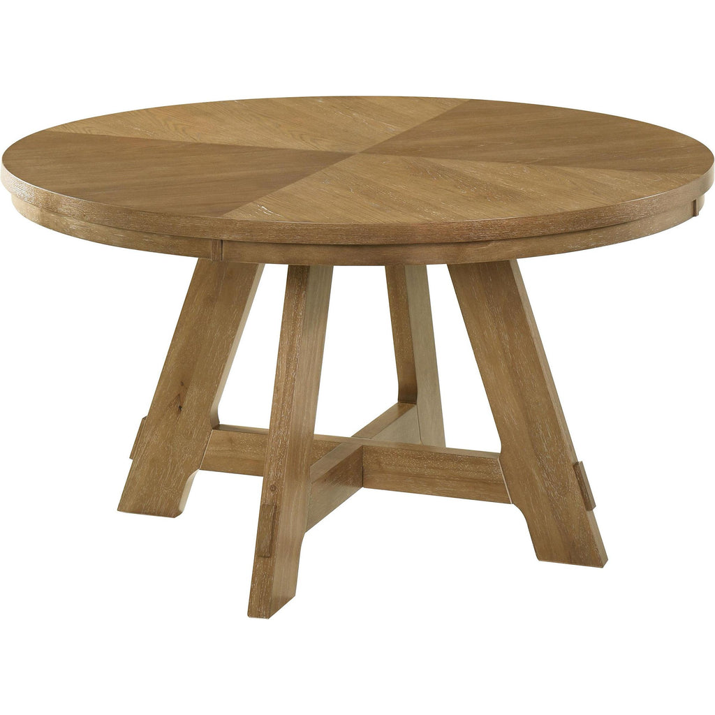 Infuse your kitchen or dining room with the inviting warmth of a modern farmhouse dining set that includes a round table and four side chairs. The set is designed for casual enjoyment and vintage style, complete with a starburst wedge veneer pattern on its charming tabletop. The base of the table adds thick supports, including flared legs and crossing stretchers enhanced with joinery details. The set is ideal for a compact space, seating four comfortably with its 54-inch tabletop diameter. Its brown oak wood finish extends to four side chairs, each with a ladderback and padded seat covered in latte finish upholstery for a versatile look. This set includes one dining table and four side chairs.